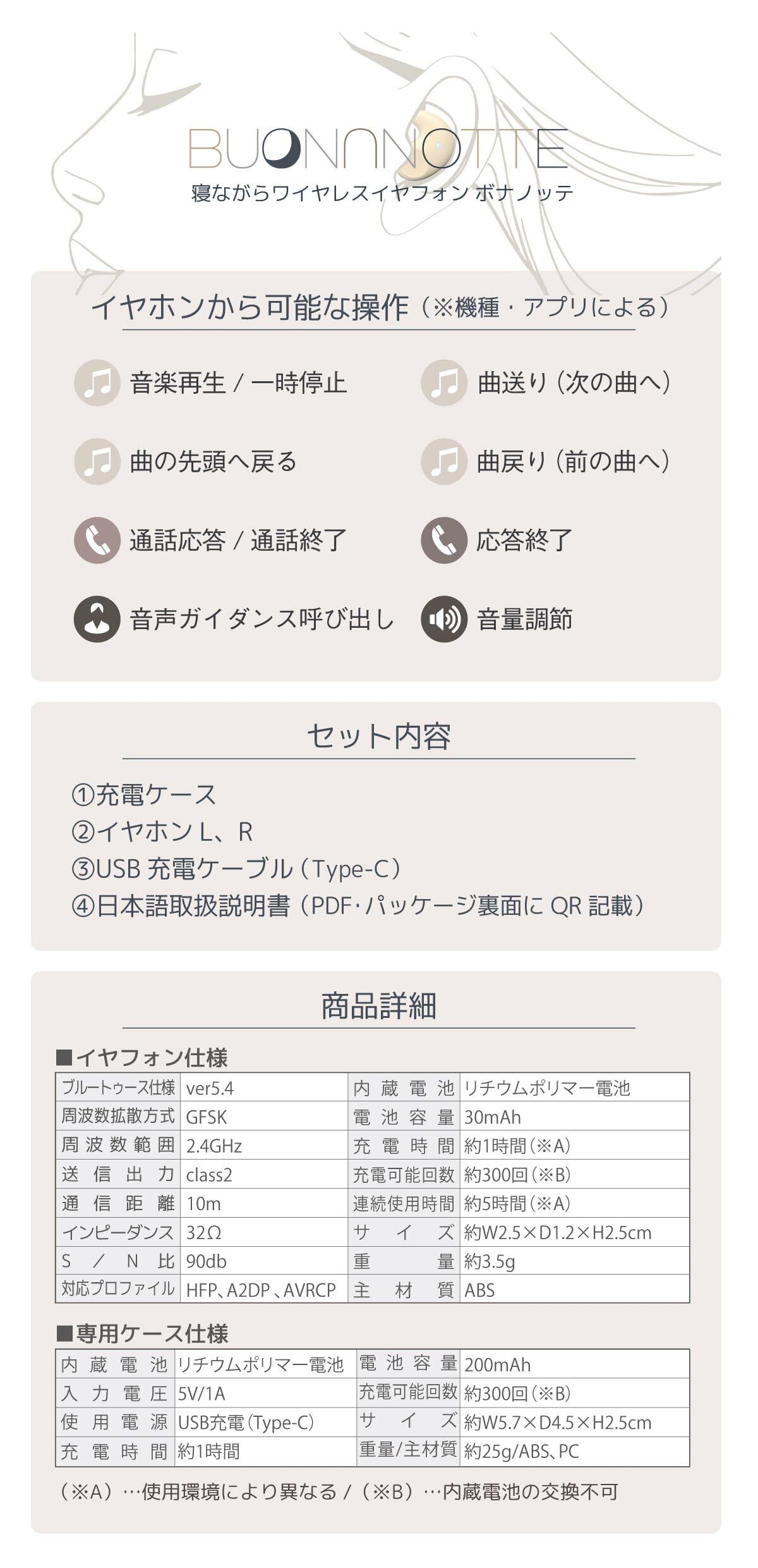 この睡眠用イヤホンでお休み前のリラックスタイム。高音質で快適な音楽鑑賞。雑音や異音を抑えたクリアな音質をお届けします。お休み前の音楽鑑賞で1日の疲れを癒し、ステキな朝をお迎えください。約 5 時間 コンパクトながら圧倒的な電池持ち!長時間の通話や長距離の移動でも安心の長時間再生。連続再生時間約5時間。 イヤホン充電時間、ケース充電時間は約1時間。壊れにくく挿し込みやすい Type-C。Type-C ならではの安定した充電が可能です。