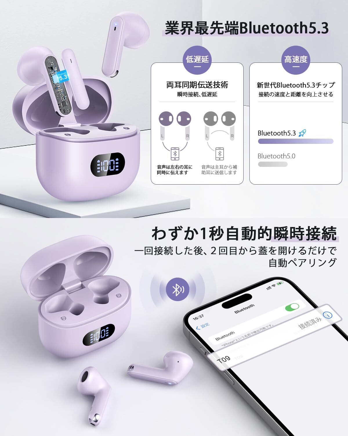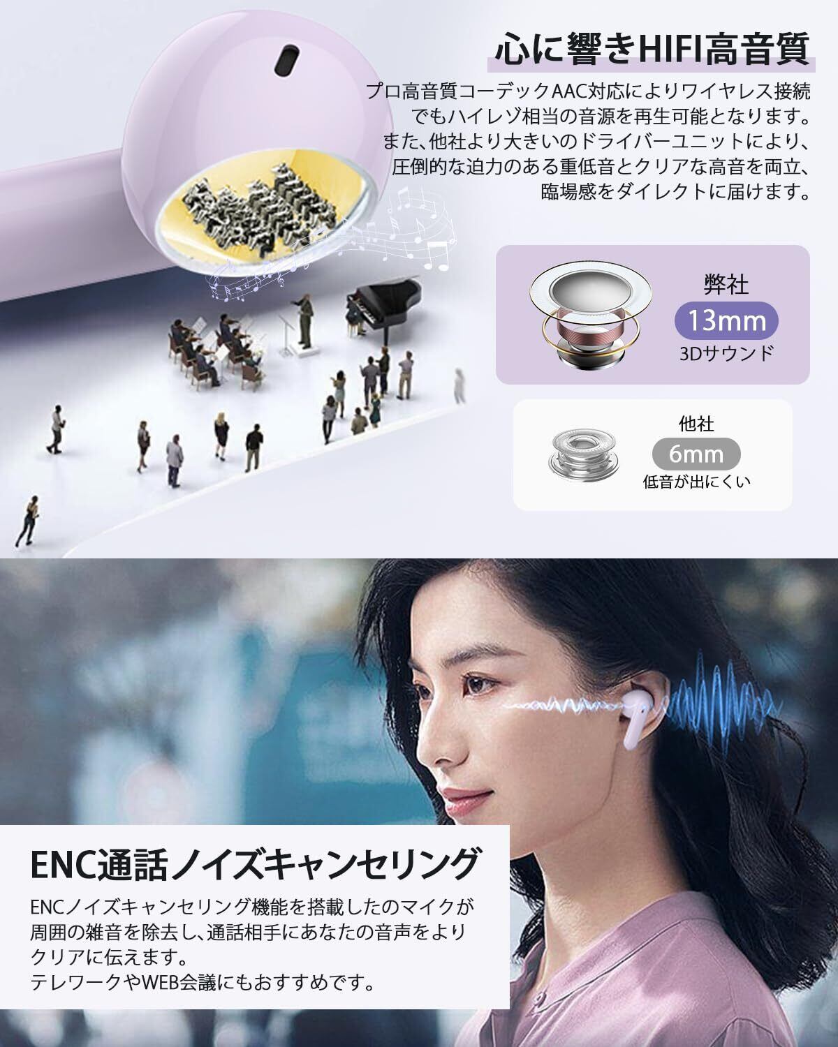 【綺麗な音を味わう・ハンズフリー通話機・ENCノイズキャンセリング】のイヤホンはHi-Fi高音質のオーディオの採用し、現場にいるようで、耳から忠実な再現でき、また録音や録画し再生する場合に発生したノイズやひずみが、最小限に抑えられる。また通話用マイクも内蔵し、通話中でノイズでたまらない方と考え、今回はCVC8.0+ENCノイズキャンセリングの組み込んでいて、やく90%の逆方向の環境ノイズを最大限にノイズの20dB低減可能し、通話している方々によりよい清楚な音声を聞き取れる。さらに片耳だけで通話できるのため、長時間に通話する必要な方は交替で充電できし、ZOOMで行いのオンライン授業、会議など最適な効率的に会話を進められる。その上、のBluetoothイヤホンはSBCだけではなく「AAC」も採用しており、SBCに比べて音質が良く、遅延も小さくなっている。そのため、Apple製品を使っている方は、AACに対応したこのブルートゥースイヤホン「T09」を用意するのがおすすめです。