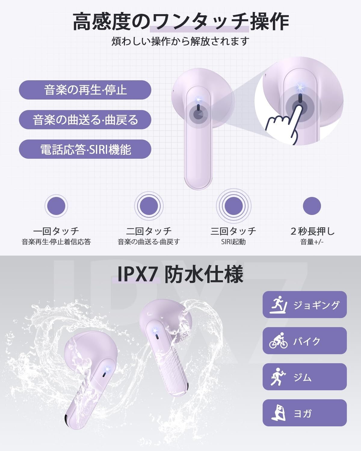 【タッチセンサーつき・簡単操作・優れな装着感】のイヤホンは市販のイヤホンの複雑な操作ボタンと比べ、耳元についているままで、ワンタッチで音楽再生/一時停止/曲送り/曲戻し/電話受け・拒否・SIRI(音声ガイダンス)などを簡単にイヤホンの操作ができ、オンライン会議、運転や家事、荷物配達などの忙しい場合もスマホを取り出す必要なく、ひと指で全て実現できます。さらにカナル型イヤホンに苦手な方々もいるとおもい、今回はインナーイヤー型のイヤホンをデザインし、カナルより中音域から高音域にかけて音の広がりが良くなり、爽やかな音質を楽しめる上で圧迫感も少なく、耳に揺らぎないし、長時間使用しても耳への疲労感も少ないし、いつも自分の耳に合うイヤーピースが見つからない方はぜひ試してみてください。