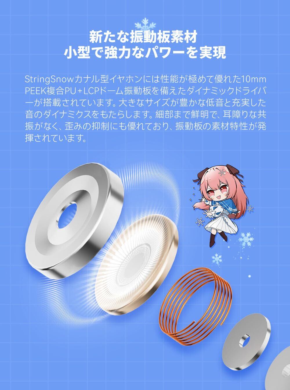 【10mm PEEK複合PU+LCPドーム振動板】弦雪 StringSnowカナル型イヤホンは1DDカナル型イヤホンで性能が極めて優れた10mm PEEK複合PU+LCPドーム振動板を備えたダイナミックドライバーが搭載されています