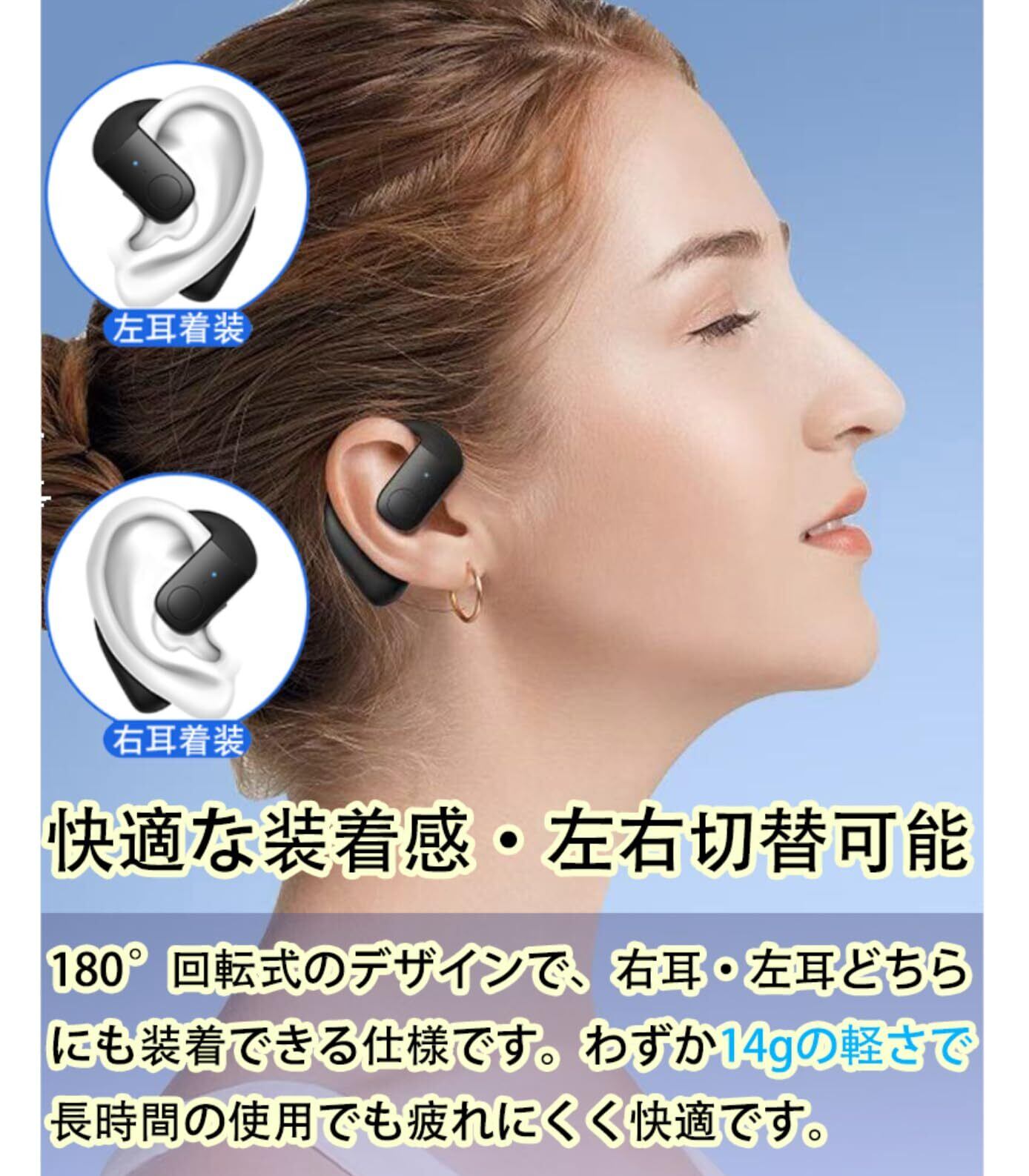 【快適装着&左右耳に対応】 本イヤホンは人間工学に基づいて設計され、重量約14gの軽量仕様により、長時間の使用でも負担を感じさせません。柔軟なシリコン素材が耳にしっかりフィットし、運動中も安定した装着が可能です。左右どちらの耳にも装着できる回転設計を採用しており、使用スタイルに合わせて調整できます。耳を塞がずに音を伝える新構造により、骨伝導製品で感じやすい音漏れや違和感を軽減。周囲音との自然なバランスを保ちながらクリアな音場を再現します。