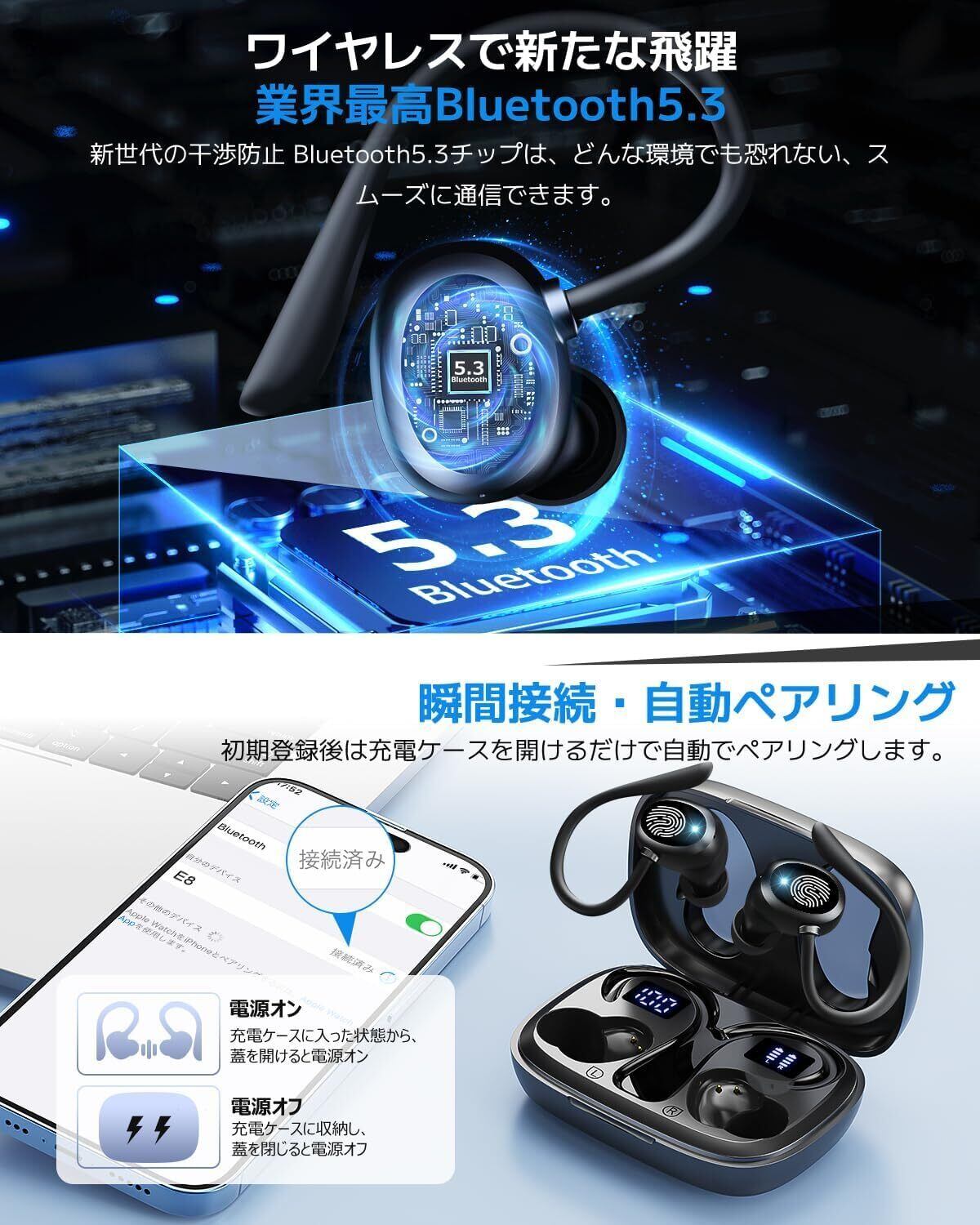 「臨場感ある高音質音楽体験」E8 ワイヤレスイヤホンは卓越した音質を提供し、ユーザーに臨場感ある音楽体験をお届けします。先進のオーディオテクノロジーにより、クリアでバランスの取れたサウンドを実現し、細やかな音のニュアンスまで表現します。さらに、先進の10mmダイナミックドライバーも搭載し、迫力溢れるサウンドを提供します。この大口径ドライバーは、低音から高音まで広範囲の周波数を精緻に再現し、ユーザーに没入感ある音楽体験をもたらします。「安定したBluetooth接続」E8 イヤホンはBluetoothバージョン5.3を搭載し、卓越した接続の安定性を提供しています。この先進的なテクノロジーにより、より迅速なデータ転送と広範な通信距離を実現し、ユーザーに途切れのない高品質な音楽体験をもたらします。この優れた性能は、日常の様々なシーンでE8 耳掛け式イヤホンを活用する際に、ユーザーに満足感と利便性を提供します。様々なデバイスと簡単にペアリングでき、スマートフォン、タブレット、パソコンなどとの互換性があります。