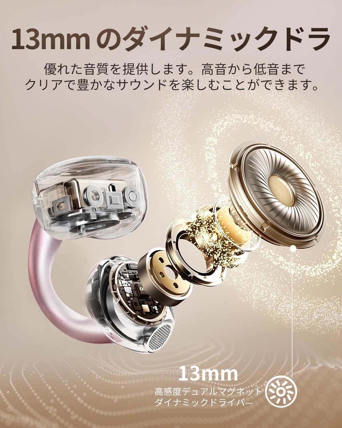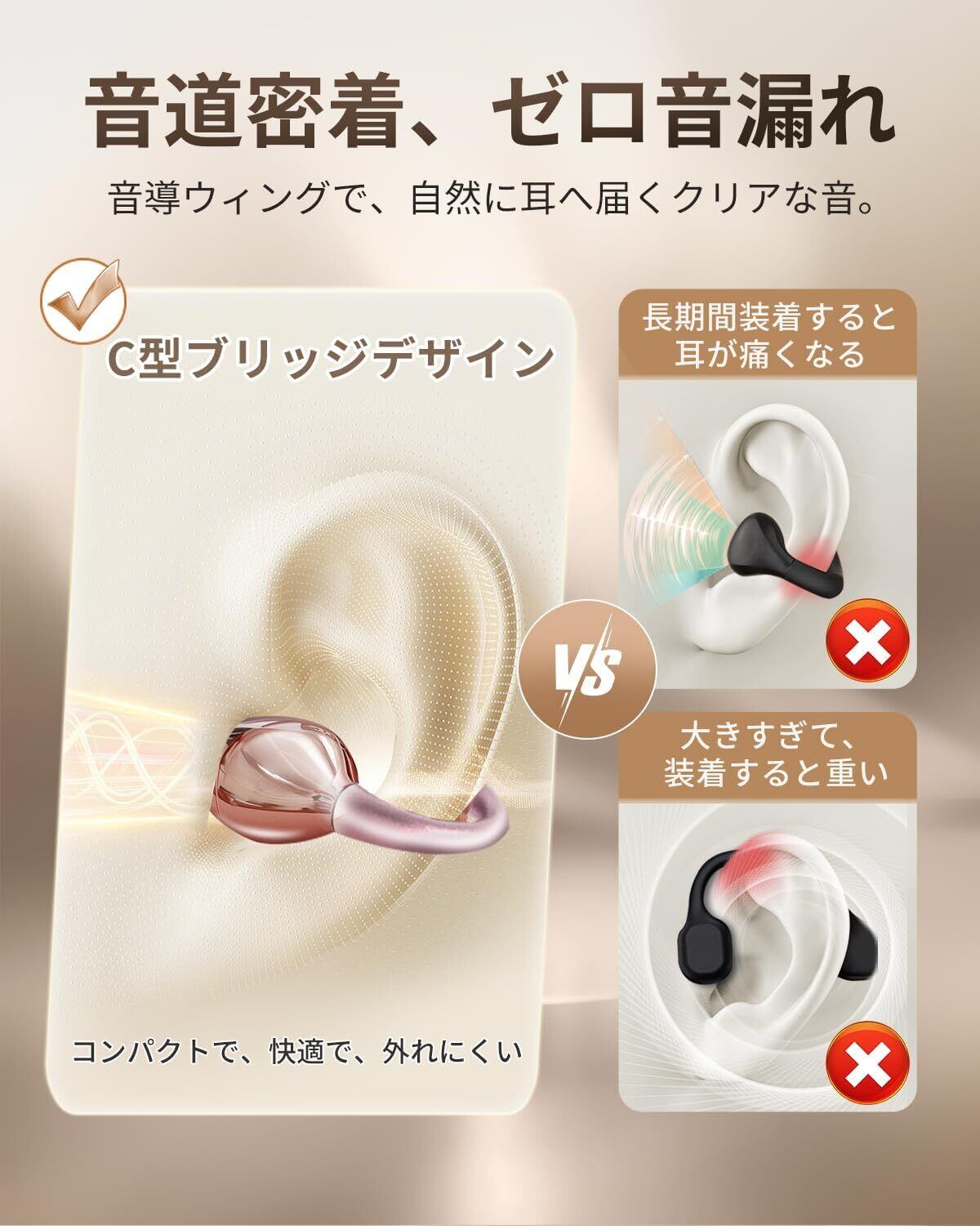 1.高速接続と安定した装着感を実現 Bluetooth 5.4 搭載のこのイヤーカフ イヤホンは、多点リンク機能によりスマホとタブレットなど複数デバイスを同時接続可能。イヤホン bluetoothの中でも優れた接続安定性を誇り、音飛びを大幅に低減。オープン式メモリーメタルの自動復帰構造と銀翼半入耳エアーカフデザインにより、イヤーカフ イヤホン bluetoothとしてメガネをかけても圧迫感なく装着でき、長時間使用でも「耳が痛くならない」安心感を提供。