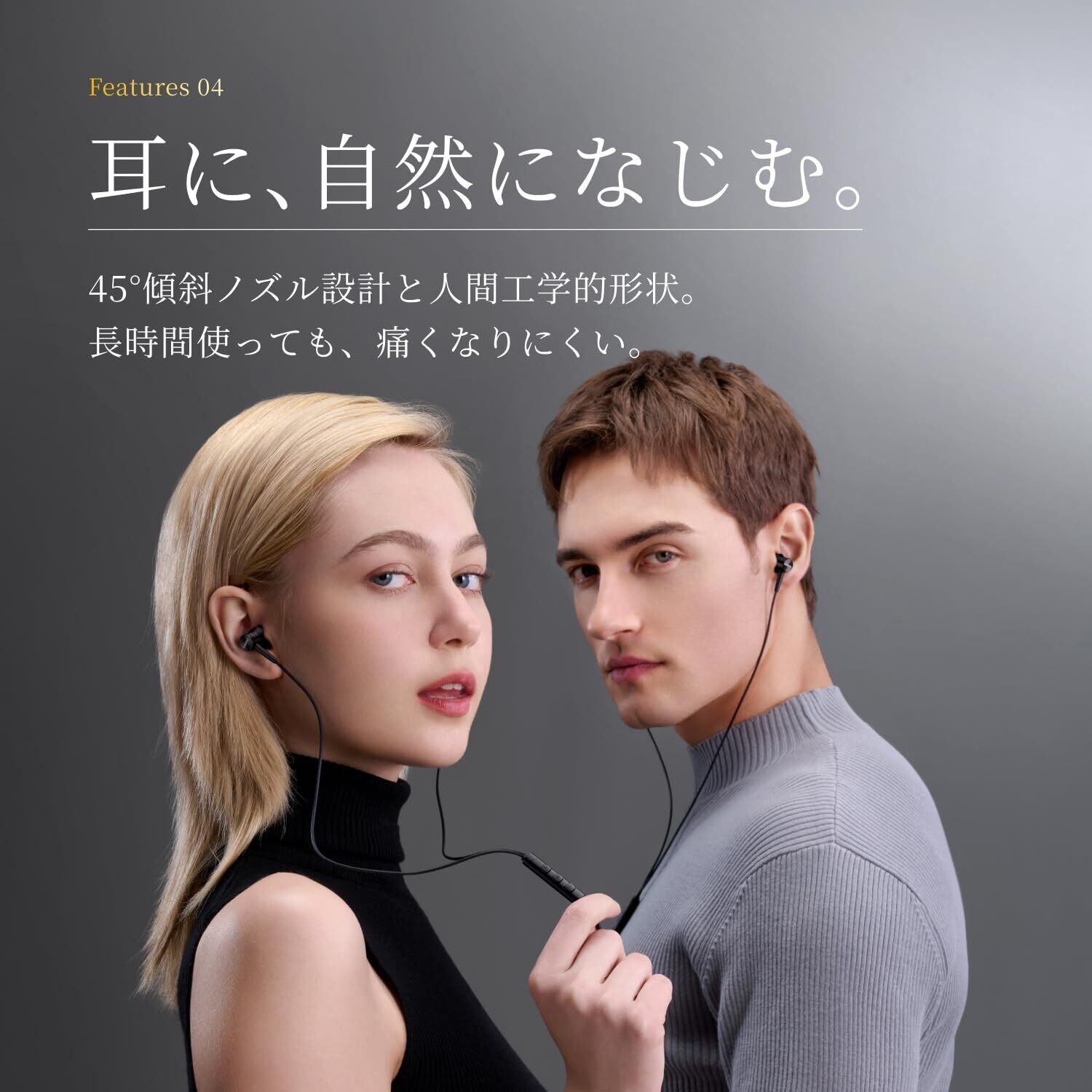 【快適なフィット感&人間工学デザイン】 45°の斜め挿入デザインと2段階角度設計で、耳にしっかりフィットしながらも痛くなりにくい快適設計。長時間の使用でも疲れにくく、音漏れを抑え集中して楽しめます。