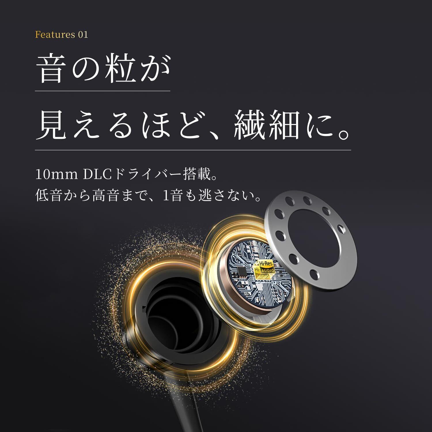 【DLC振動板採用 10mmダイナミックドライバー】 10mmドライバーに搭載されたDLC(ダイヤモンドライクカーボン)振動板が、豊かな低音と繊細な高音を両立。小型ながら迫力あるサウンドで、音楽のディテールを余すことなく再現します。