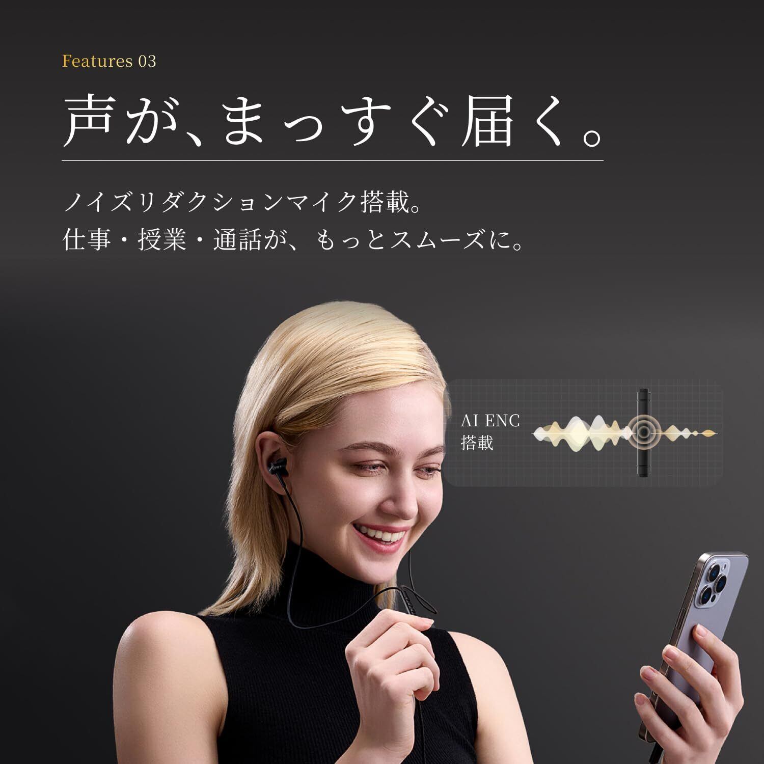 【AI ENCノイズキャンセリングMEMSマイク】 高性能MEMSマイクとAI ENCノイズキャンセリングにより、雑音を抑えてクリアな通話・録音が可能。オンライン通話・会議時にもクリアな音声を届けます。