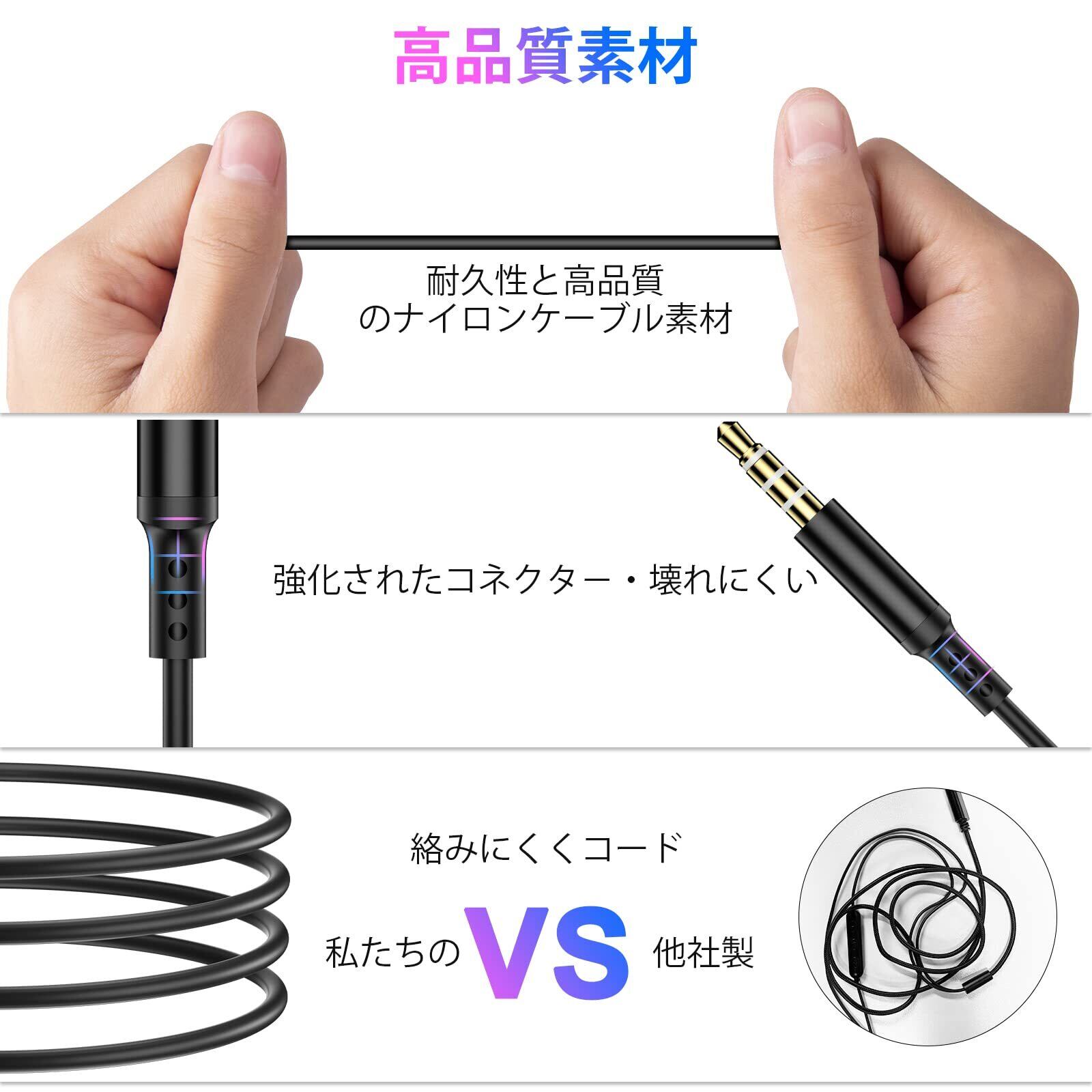 高品質素材をフィット感抜群:イヤホン内芯の部分は硬い素材を採用ことで音の通路の形状を保持して音質劣化を防止し、外側のケーブル部分は柔らかいTPE素材を用いることで断線にくい、イヤーピースは柔らかい肌に優しいシリコン材質で耳へのフィット感を向上させました。長時間を掛けても耳が痛みを感じにくいです。