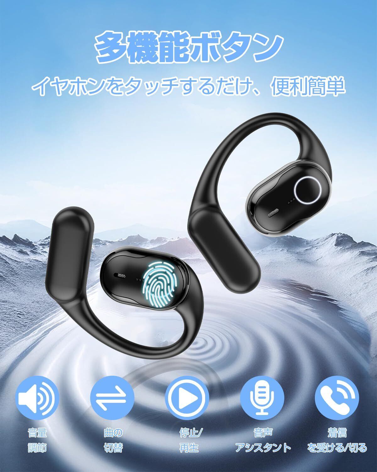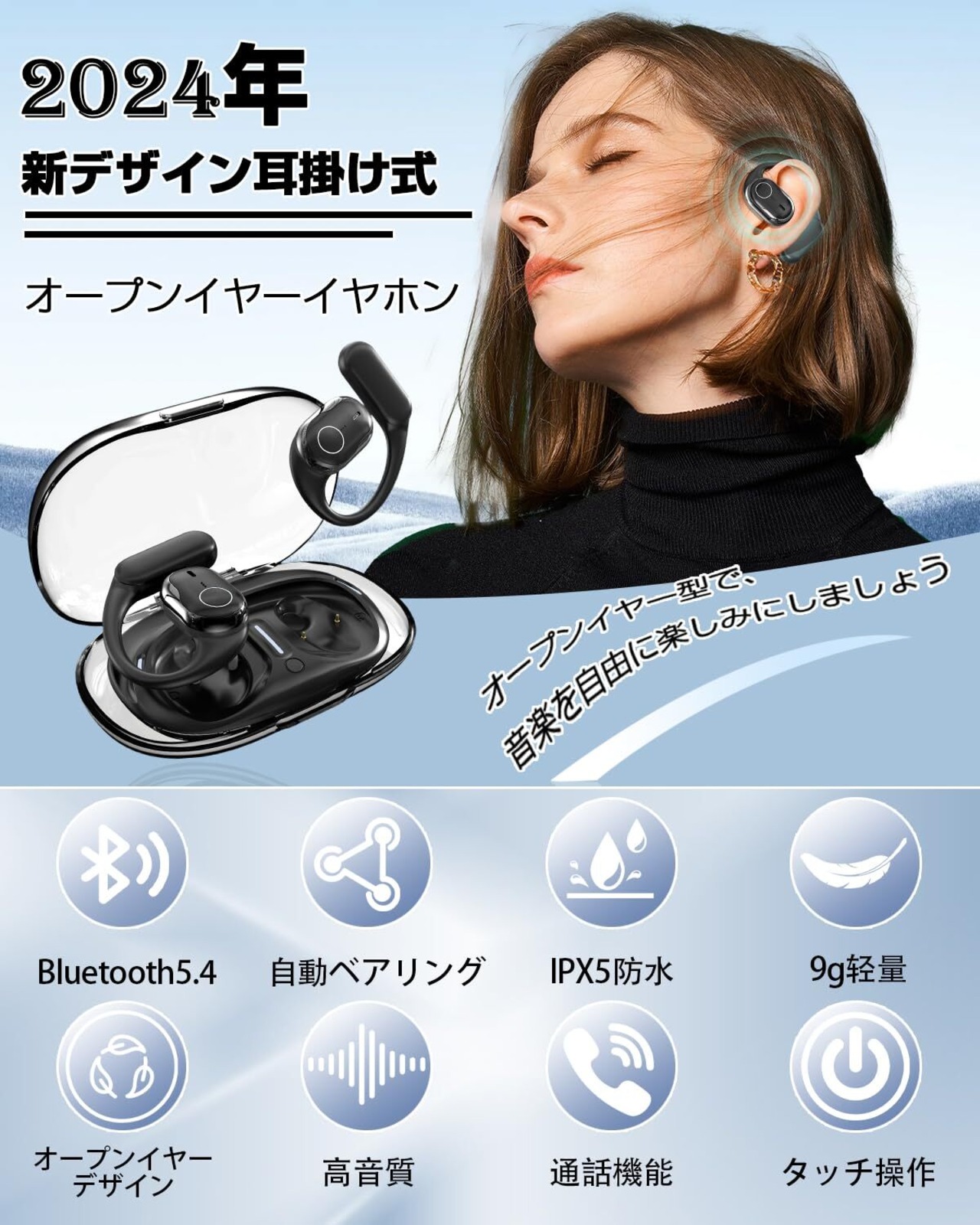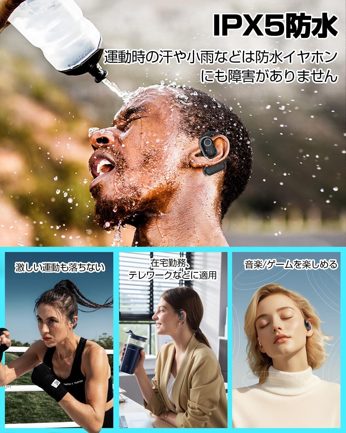 【ながら聴き、カナル型が苦手な人におすすめ!】2024年コスパ最高のオープンイヤー イヤホンでございます。初めて イヤホン を使う方におすすめです。耳の穴が小さい人にとっては、入耳式イヤホンを使用すると、耳の穴に入れづらかったり、抜けやすくなったりする場合があります。長時間使用して耳を圧迫するなどの不便もあります。耳掛け式イヤホンの場合、イヤホンが抜けてくる心配はない、耳を塞がず、耳を圧迫せず、長時間使用しても違和感がありません。耳の穴を塞がないオープンイヤーデザインを採用しており、ワイヤレスイヤホン bluetoothの閉塞感や圧迫感が苦手な人にも向いています。