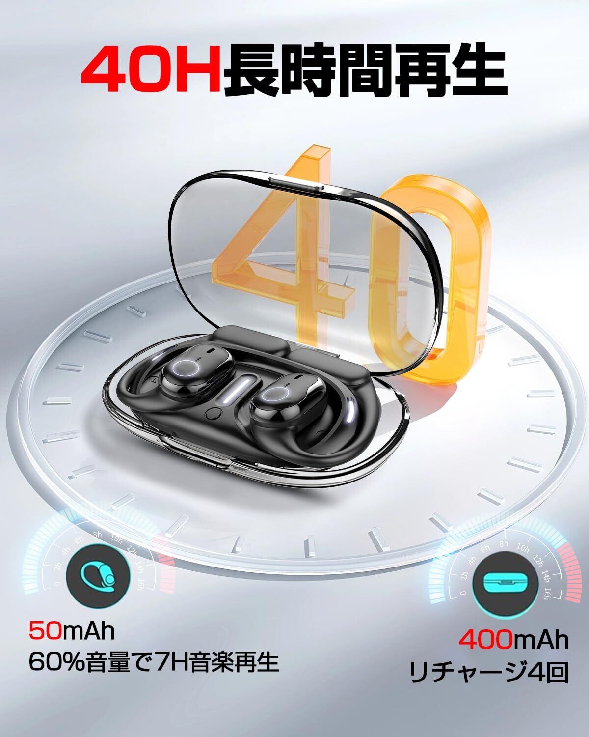 【6時間連続使用可能・軽量設計でわずか9グラム】耳掛け式イヤホン bluetooth ワイヤレスは、6時間以上の連続再生が可能な長時間バッテリーを内蔵しており、一日中音楽を楽しんだり、ゲームやドラマを視聴することが問題なく可能となります!また、最新の音響振動子技術を採用し、一日中快適に使用できます。ブルートゥース イヤホンは主流Type-C急速充電に対応して、わずか2時間の充電で最大40時間の音楽連続再生が可能です。9gの軽量設計で、装着していることを忘れるほどの自然なつけ心地を実現しています。