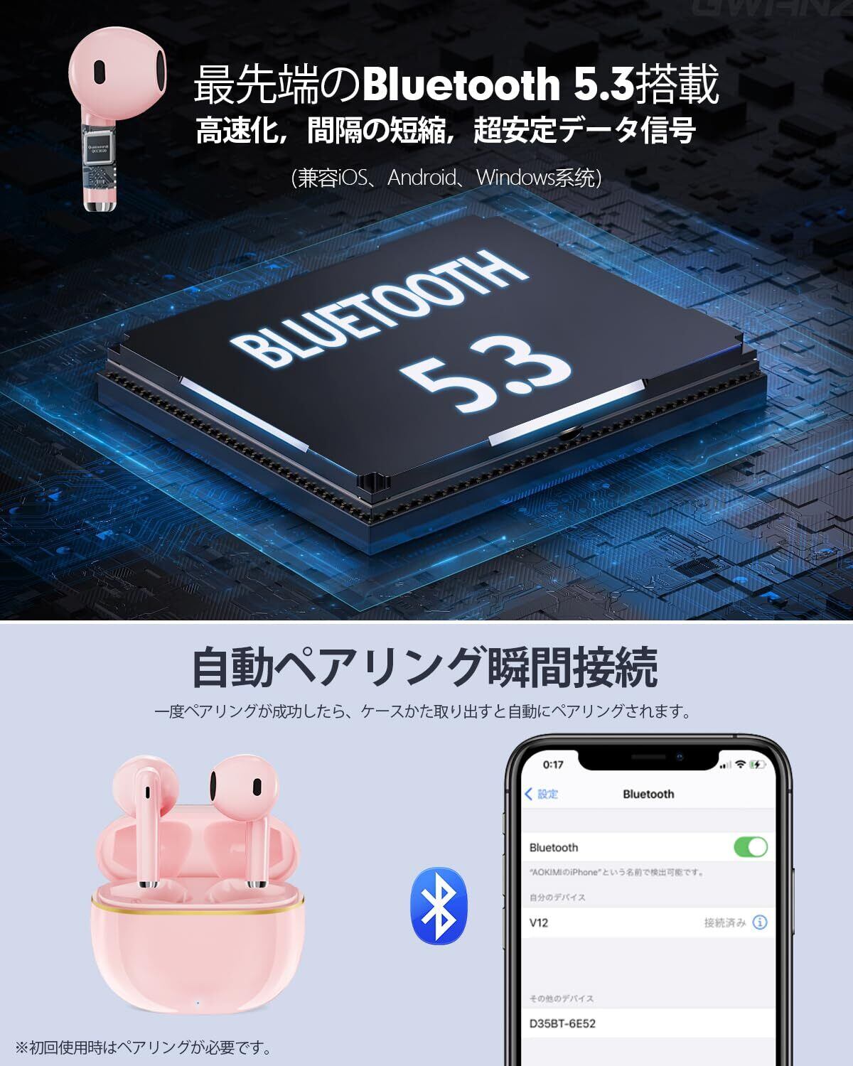 【2025年アップグレード版】AOKIMI ワイヤレスイヤホン bluetooth イヤホン V12 小型軽量 ブルートゥースHi-Fi 最大36時間再生 ぶるーとぅーす コードレスイヤホン ENCノイズキャンセリング 自動ペアリング Type-C充電 マイク付き 防水 タッチ式音量調整 スポーツ/通勤/通学/WEB会議(ピンク) | kki