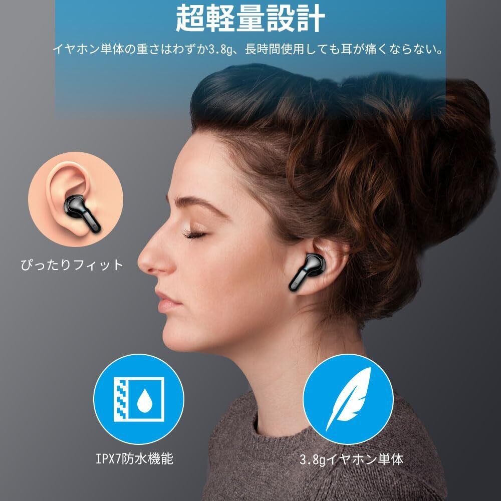 【快適な装着感とIPX7防水機能】ワイヤレスヘッドホンは人間工学設計に基づいて、耳の形状に合わせてぴったりフィット。イヤホン単体の重さはわずか3.8g、ほとんど負担を感じない装着体験を提供しています。高感度なタッチ操作式で音楽の再生/一時停止、曲送り/曲戻し、音量調節、Siri/Googleアシスタントなどの操作に対応します。また、IPX7防水性能が優れて、突然の小雨やスポーツ時の汗の侵入を防止でき、イヤフォンをしっかり守ります。日常生活の使用中、ジョギング、ランニング、ヨガ、通勤、通学、登山、仕事中、勉強中などさまざまなシーンで快適に使用できます。