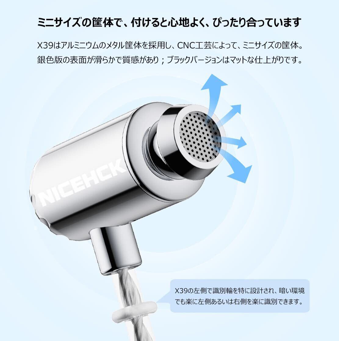 - X39はアルミニウムのメタル筐体を採用し、CNC工芸によって、ミニサイズの筐体、銀色版の表面が滑らかで質感があり、ブラックバージョンはマットな仕上がりです;X39イヤホンの左側で識別輪を特に設計され、暗い環境でも楽に左側あるいは右側を楽に識別できます;ミニサイズの筐体で、付けると心地よく、ぴったり合っています