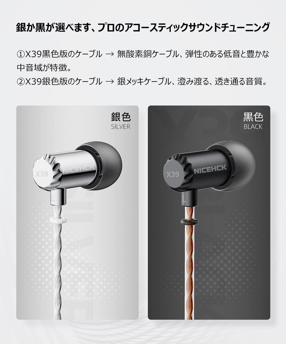 -X39イヤホンは、銀か黒が選べます、プロのアコースティックサウンドチューニング;①黒色版のケーブル → 無酸素銅ケーブル、弾性のある低音と豊かな中音域が特徴;②銀色版のケーブル → 銀メッキケーブル、澄み渡る、透き通る音質