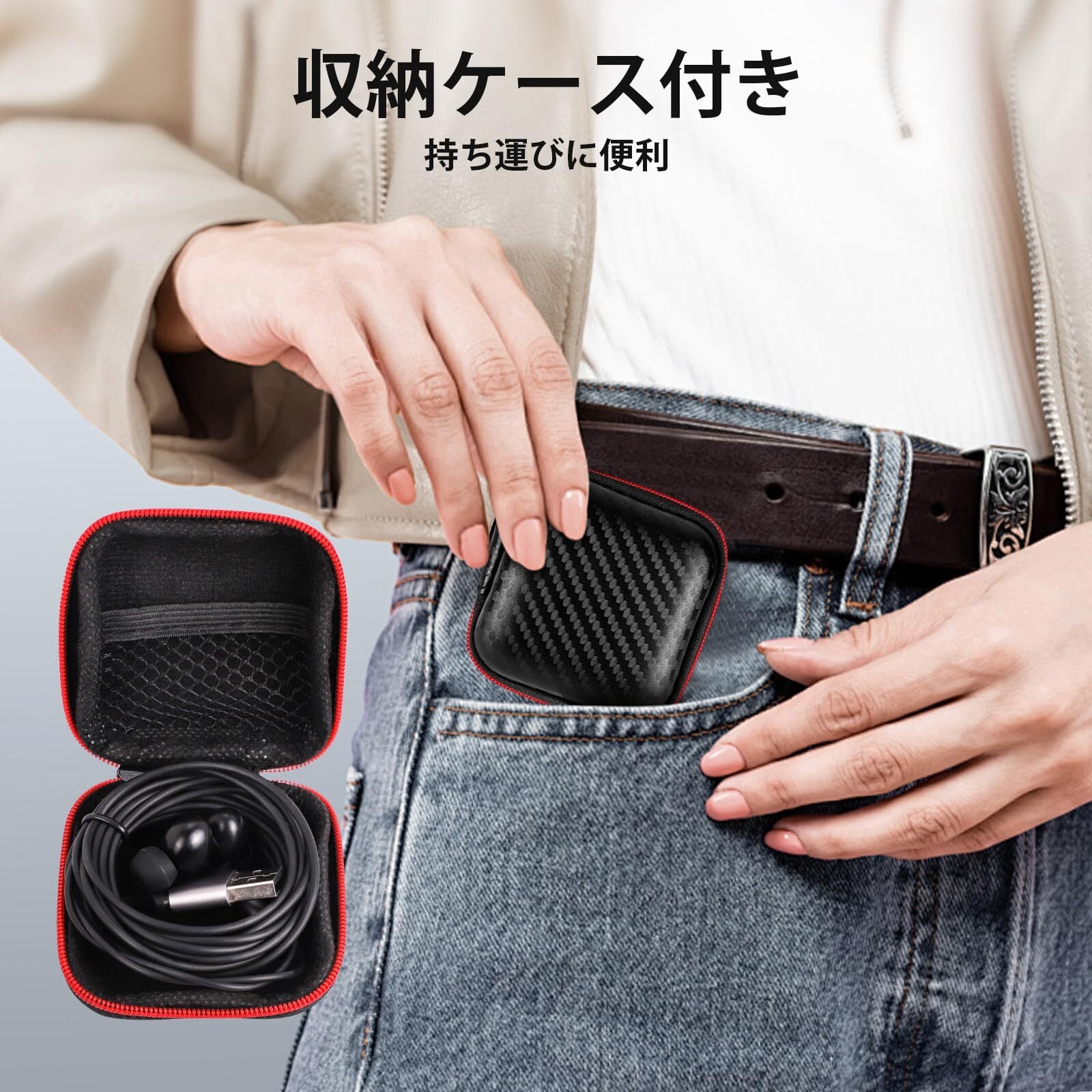 収納ケース付き:パッケージには収納ケースと3つサイズのシリコーン製のイヤーチップが用意され、耳の大きさにより適切なイヤーキャップを選ぶことができます。収納ケースはUSBイヤフォンやその他のアクセサリ小物を安全に保管でき、持ち運びも簡単です。クリップはマイクの収音すると、ケーブルを衣服に留める使用できますので、イヤホンがぐらつく心配がなく、そのままで話すと相手にもっとクリア声が聞こえます。