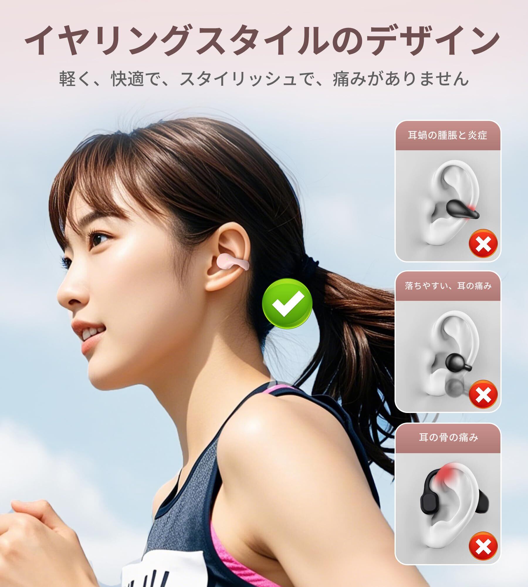 King Lucky イヤーカフ型ワイヤレスイヤホン|オープンイヤー設計|Bluetooth5.3対応|IPX4防水|マイク内蔵|急速充電|音漏れ防止|CVC通話対応|携帯空気伝導|日本設計|耳挟み式|骨伝導技術革新|Hi-Fi 長時間使用可能(ピンク) | kki