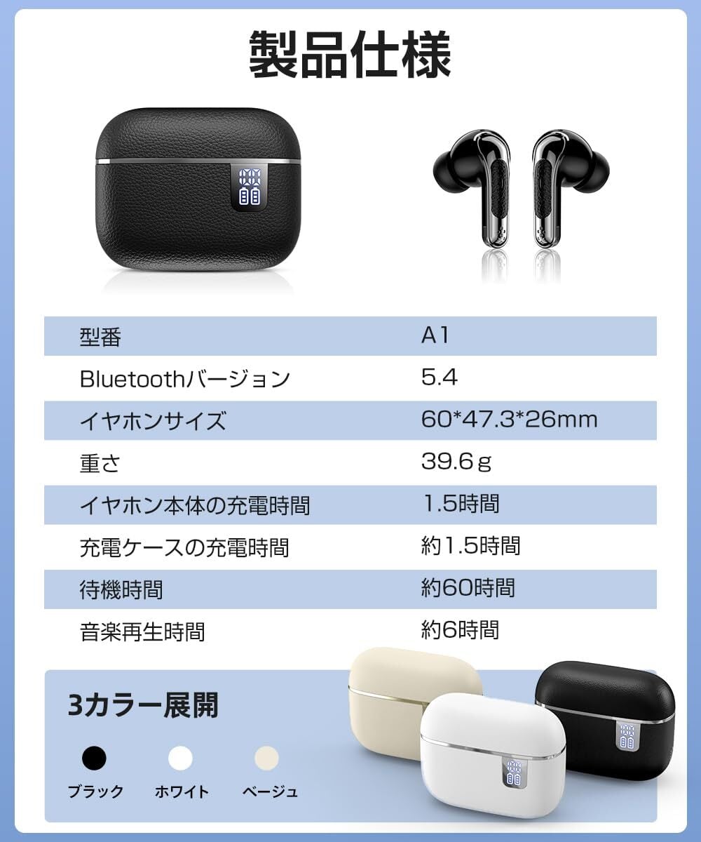【いろんなシーンで】通学、通勤、会議、運動中、動画視聴など、様々なシーンで活躍する万能イヤホンです。【パッケージ内容】Bluetoothイヤホン本体、充電式収納ケース、Type-C充電ケーブル、日本語取扱説明書製品に関してお困りな事や不具合等がございましたら、ご心配なさらないでご連絡ください。連絡方法:アカウントサービス>注文履歴>販売元>質問する