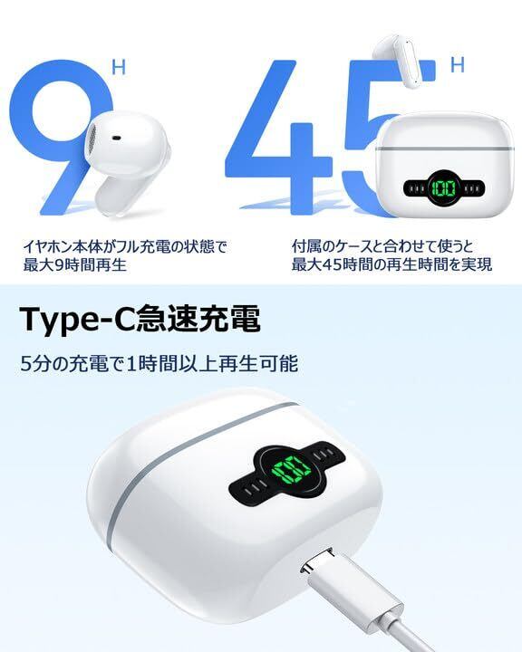 【小型/軽量·ほぼ「ゼロ」の装着感】半入耳式イヤホンは入耳式イヤホン、ヘッドホンと比較して、より快適で長く装着しても痛くなりません。片耳のイヤホンの重さはわずか4.5gだけ、超軽量で耳に負担をかけません。また、充電ケースはコンパクトで、持ち運びしやすいのが特徴です。気軽にポケットやバッグなどに収納して、いつでも利用できます。
