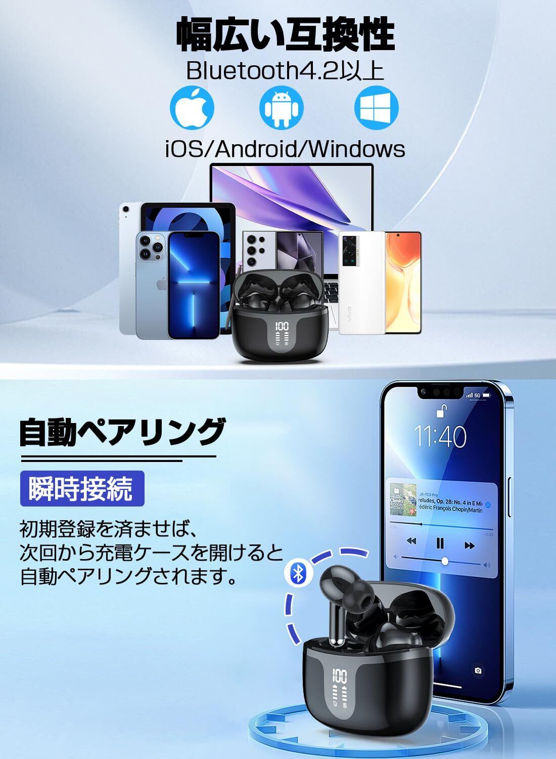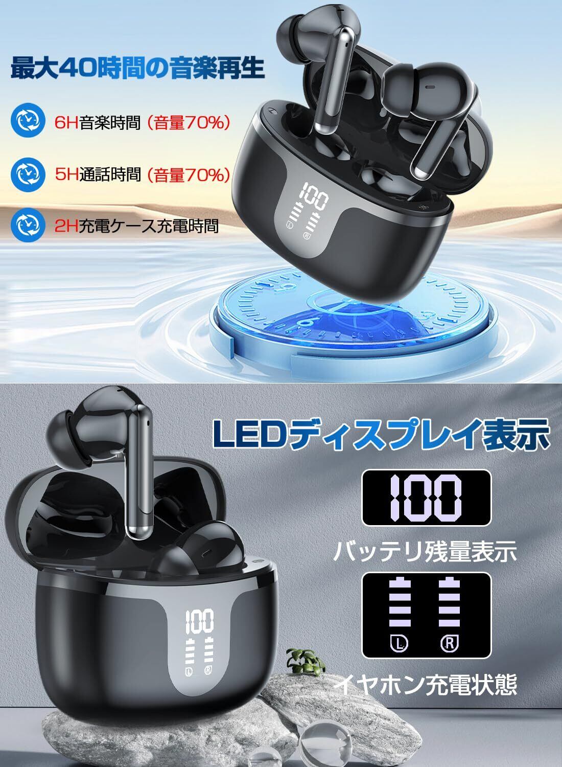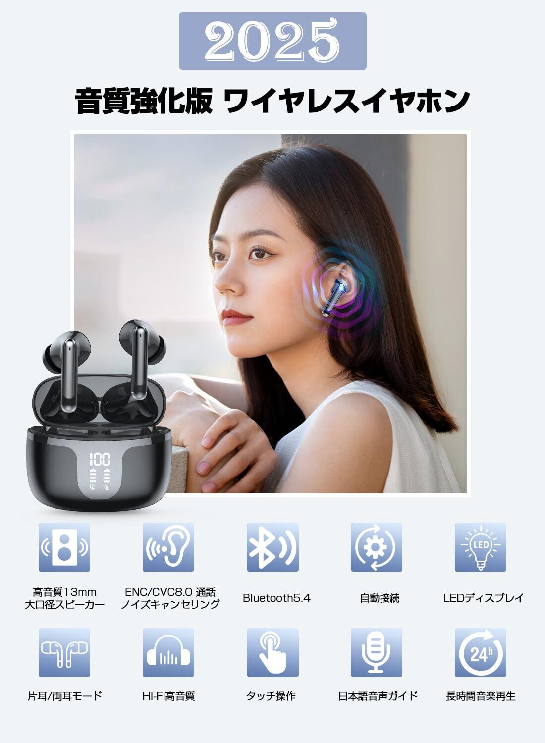 2025【Bluetooth5.4 音質強化型】 ワイヤレスイヤホン Bluetooth イヤホン ブルートゥース イヤフォン カナル式 ENC通話ノイズキャンセリング LEDディスプレイ マイク付き 自動ペアリング 快適な装着感 最大40H音楽再生 ハンズフリー通話 タッチ操作 日語音声ガイド 重低音 片耳/両耳 スポーツ/iOS/iAndroid対応(ブラック)