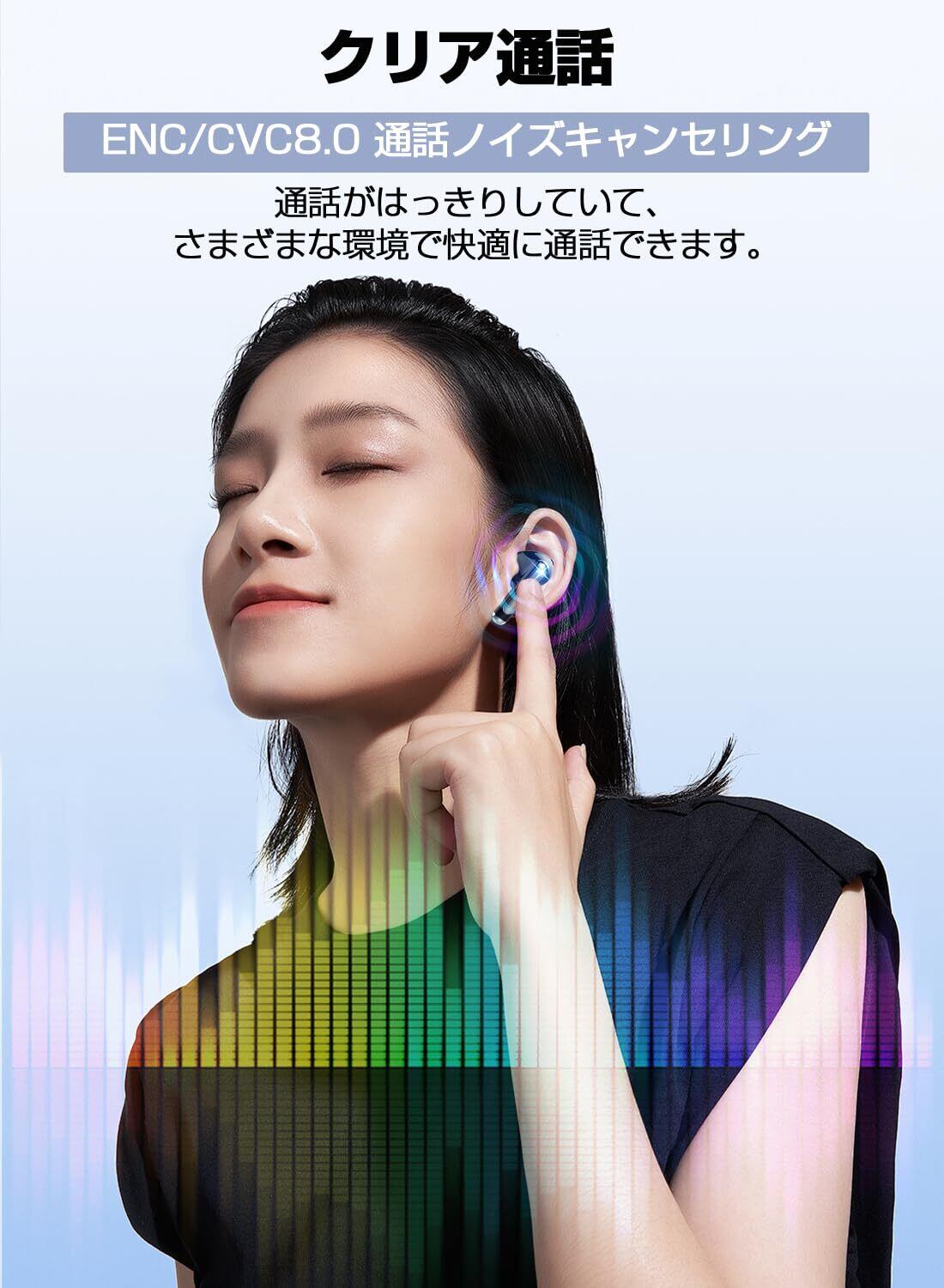 【高忠実な音質を復元・13mm大口径ドライバー・ENC通話ノイズキャンセリング】 イヤホンは低音が豊かで、高音がはっきりしていて、音質がバランスがとれていて、原音を復元し、音楽の細部をリアルに復元することができ、さまざまな楽器の音、方位、リズムを聞くことができます。音楽の現場にいるように見えます。ワイヤレスイヤホンに13mmの大口径ドライバーを搭載し、音の粒立ちが良く、歯切れのいい音楽が再生されます。迫力ある低音から自然な中音、伸びやかな高音まで幅広く楽しめ、きれいな立体的な音を与え、音楽による没入感を楽しむことができます。イヤホンは高性能マイクとENC/CVC8.0 通話 ノイズキャンセリング技術により、周囲の環境騒音を識別して感じ、最高騒音低減深さは-39 dBに達し、通話中に相手に自分の声をはっきり伝えることができる。通話、オンライン授業、会議など会話に最適!効率的に会話を進められます。