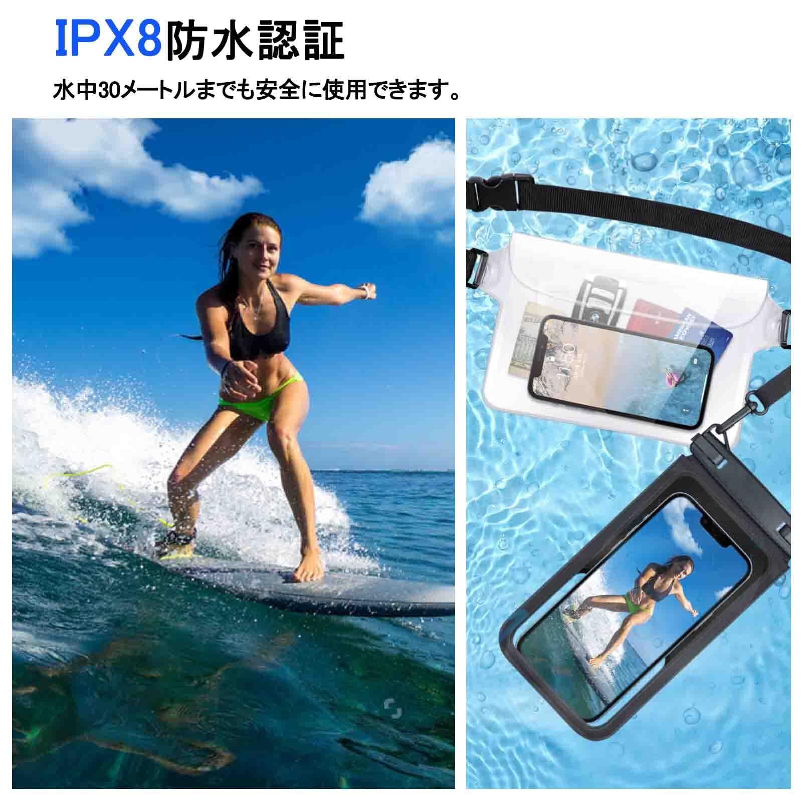 Handodo 2個セット スマホ 防水ケース(防水ウエストポーチ添付) IPX8認定 携帯用ドライバッグ ダブルパック設計 水中撮影/お風呂/温泉/潜水/雨/海用 6.7インチスマホ適用 財布 適用端末:iPhone 16 15 14 13 Mini Pro Max・iPhone 12・11・XS・XR・8・Android ブラック・クリア 通話快適 密封 タッチ可 顔認証