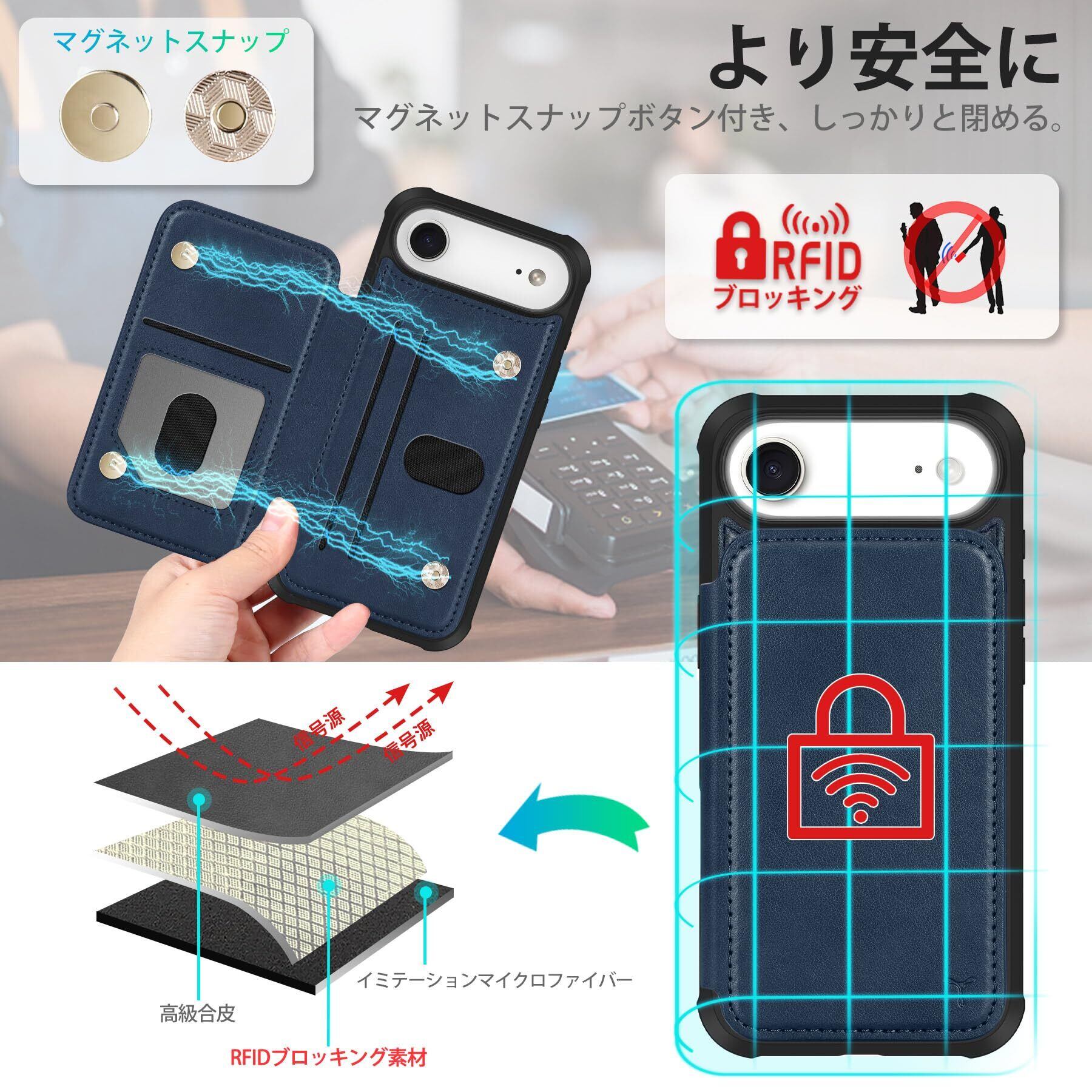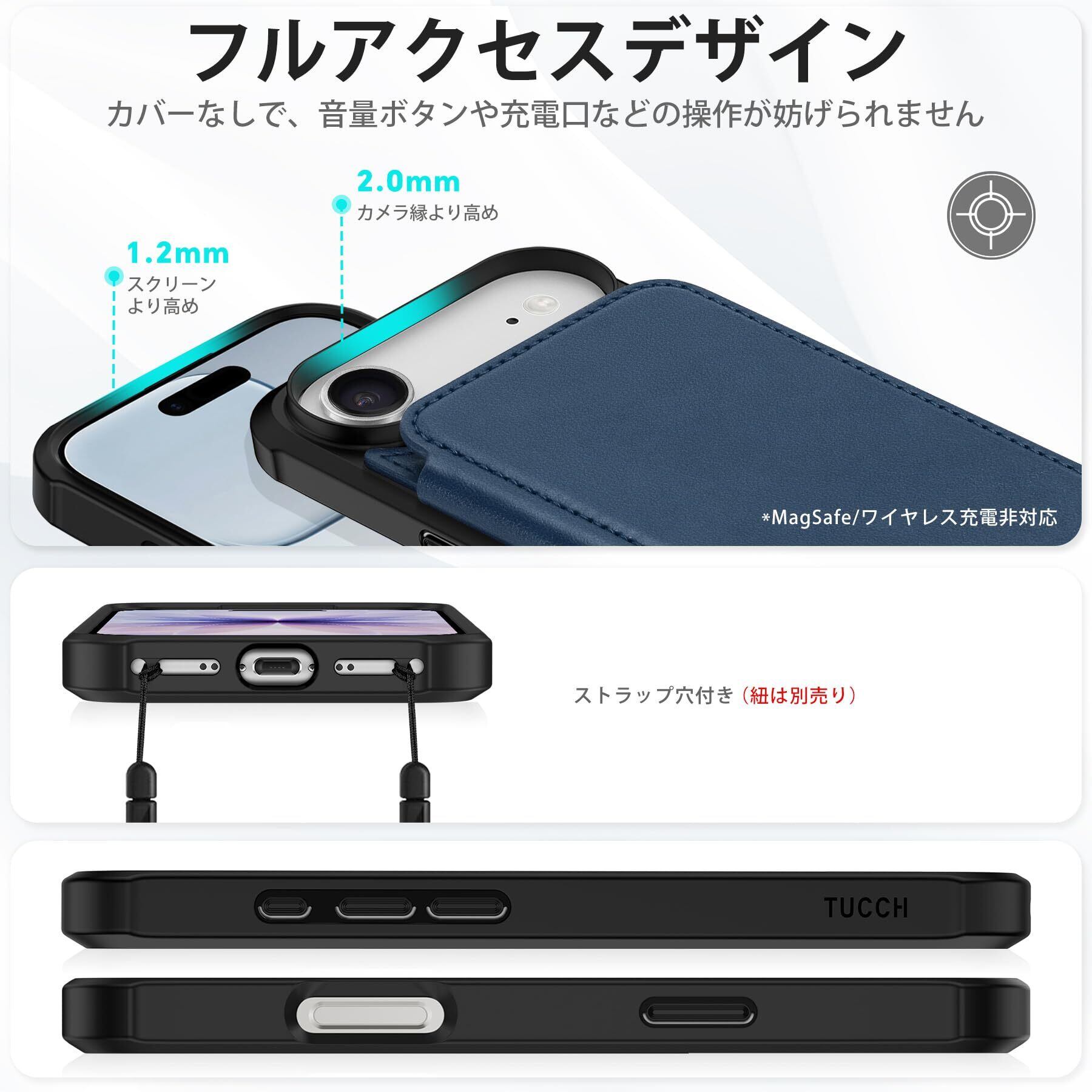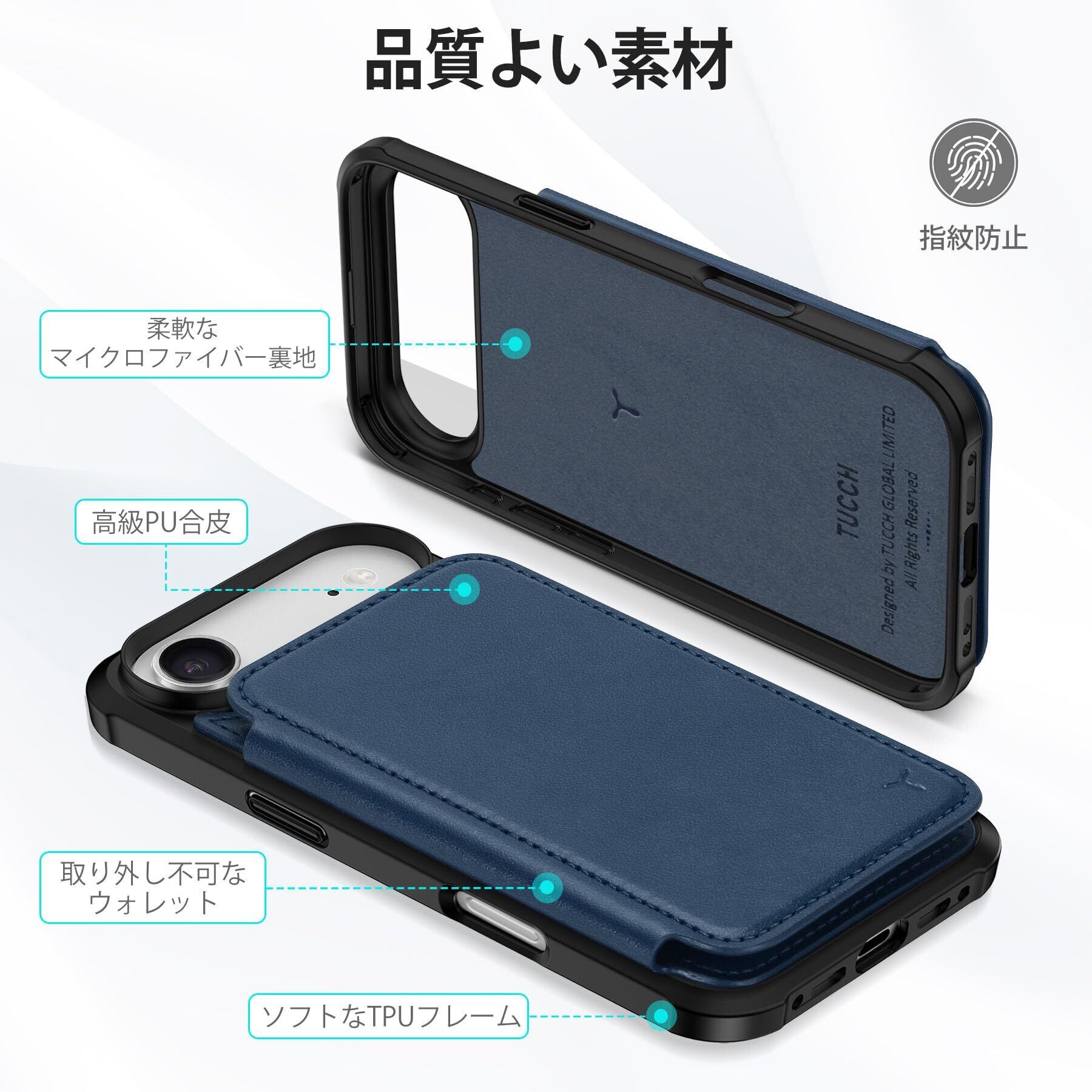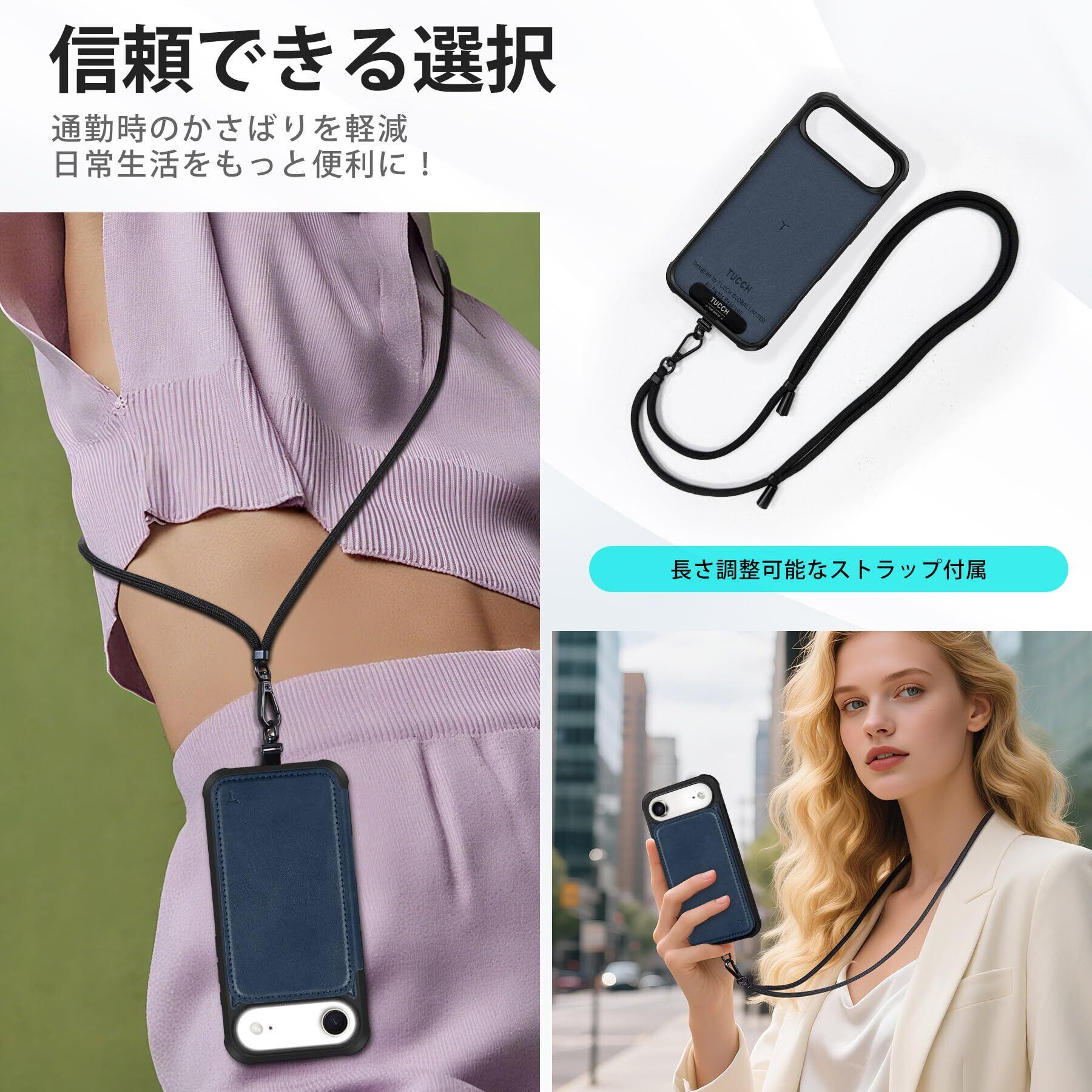 TUCCH iPhone Air 対応 ケース ショルダーストラップ付き 背面カード収納 6.5インチ PUレザー RFIDブロッキング ストラップホール付き 3つポケット 取り外し不可 財布型 TPU素材 滑り止め 衝撃吸収 マグネット開閉 アイフォン Air 対応 携帯カバー 2025年発売 ダークブルー