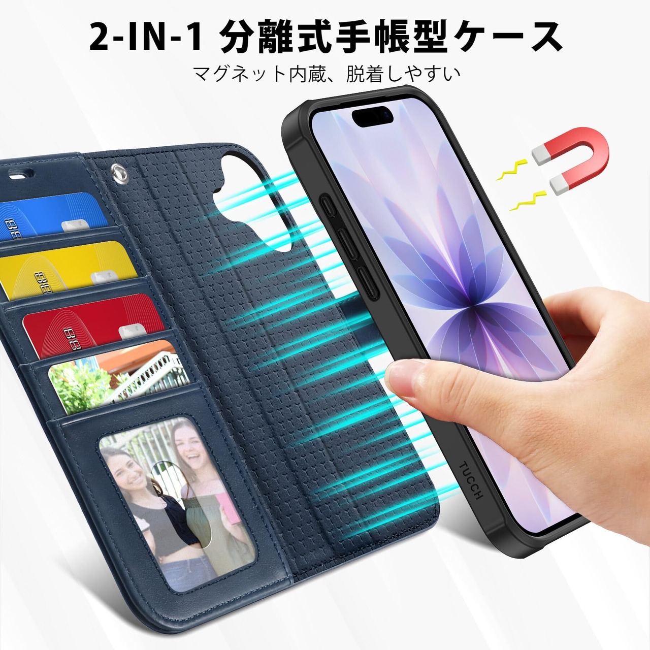 TUCCH iPhone 17 対応 ケース手帳型 2 in 1 分離式 6.3インチ ストラップ付き 取り外し可 RFIDブロッキング 4つカードポケット ストラップホール 横置きスタンド機能 衝撃吸収 全面保護 PU合皮 あいふぉん17対応携帯ケース 2025年発売 5G ダークブルー