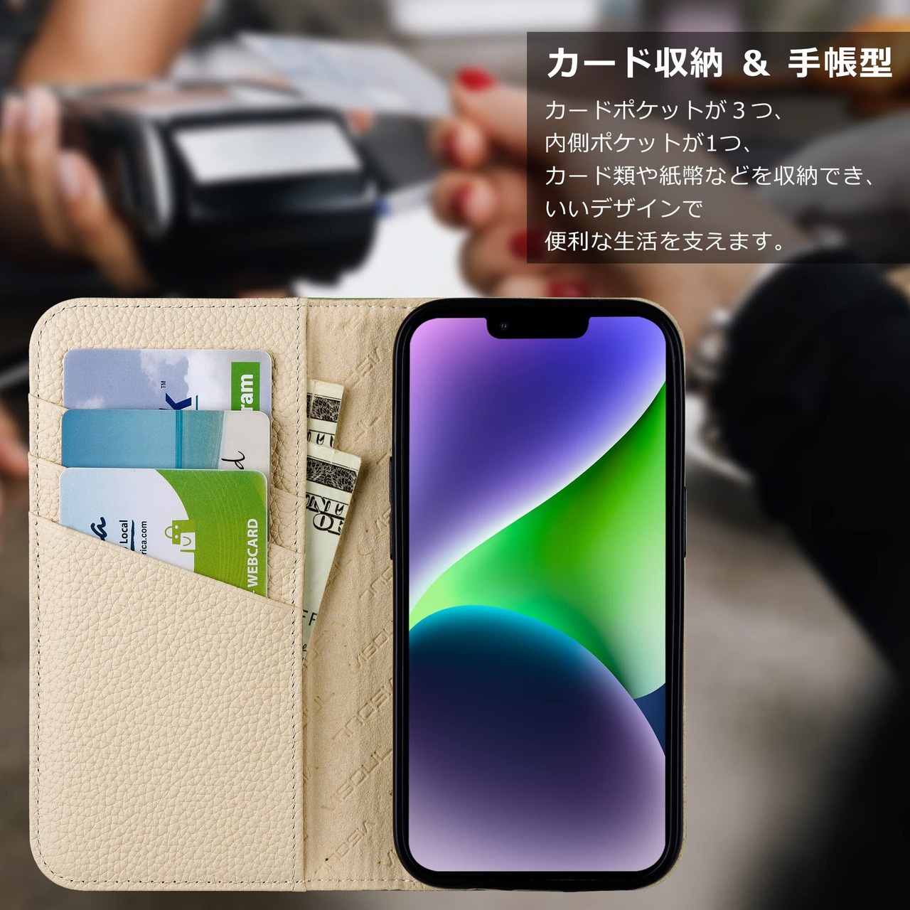 【本革手帳型ケース】背面だけでなく、画面を覆っているため、画面から直接地面に落ちる場合は、スマホの画面を保護してくれるので安心といったイメージがあります。カバーの面積が広くなり、カバーの外側や内側を有効利用できる点も手帳型の魅力の1つでしょう。カバーの内側にポケットがあり、カード型のものを収納しておけます。定期やクレジットカードといったものは、生活する上で頻繁に使いますよね。