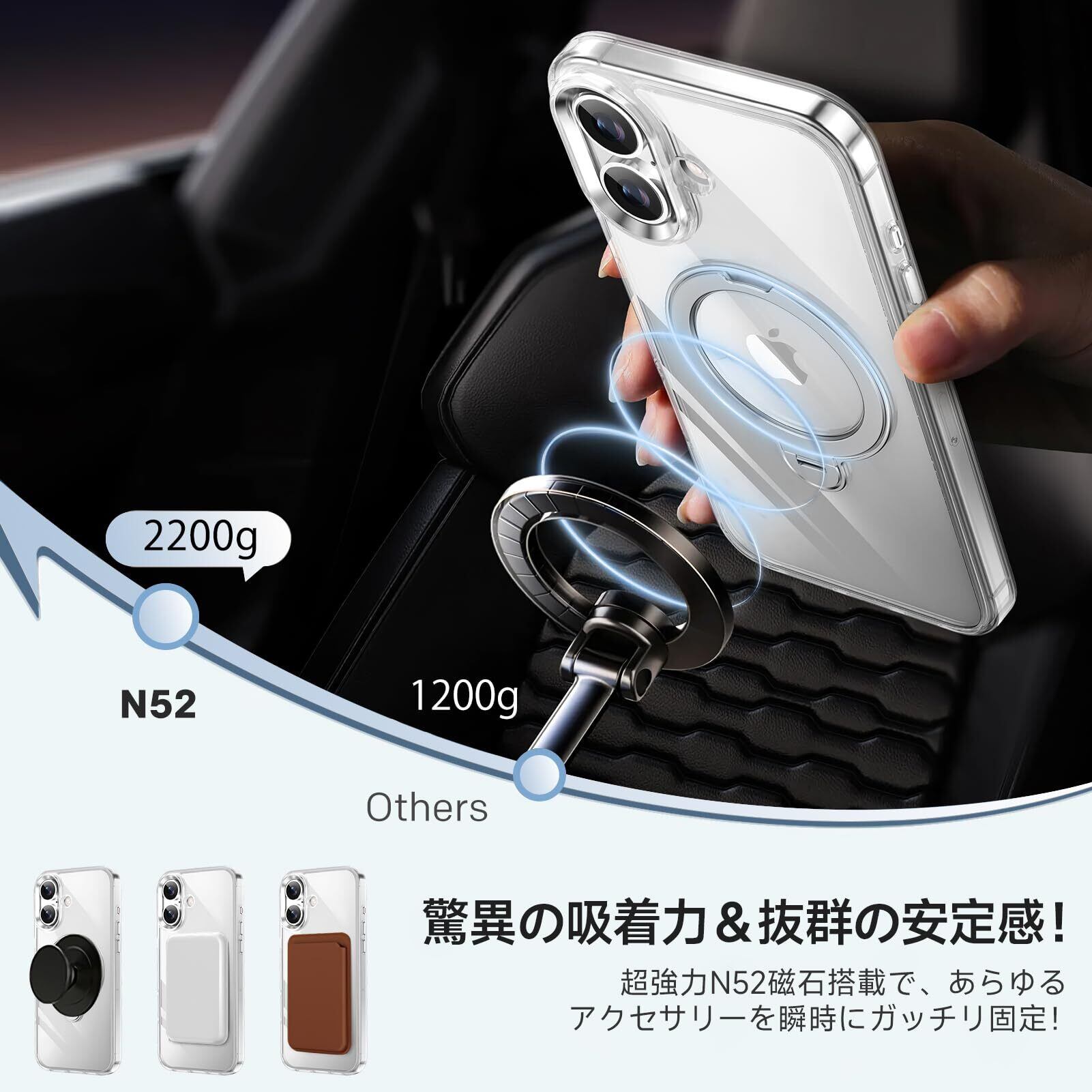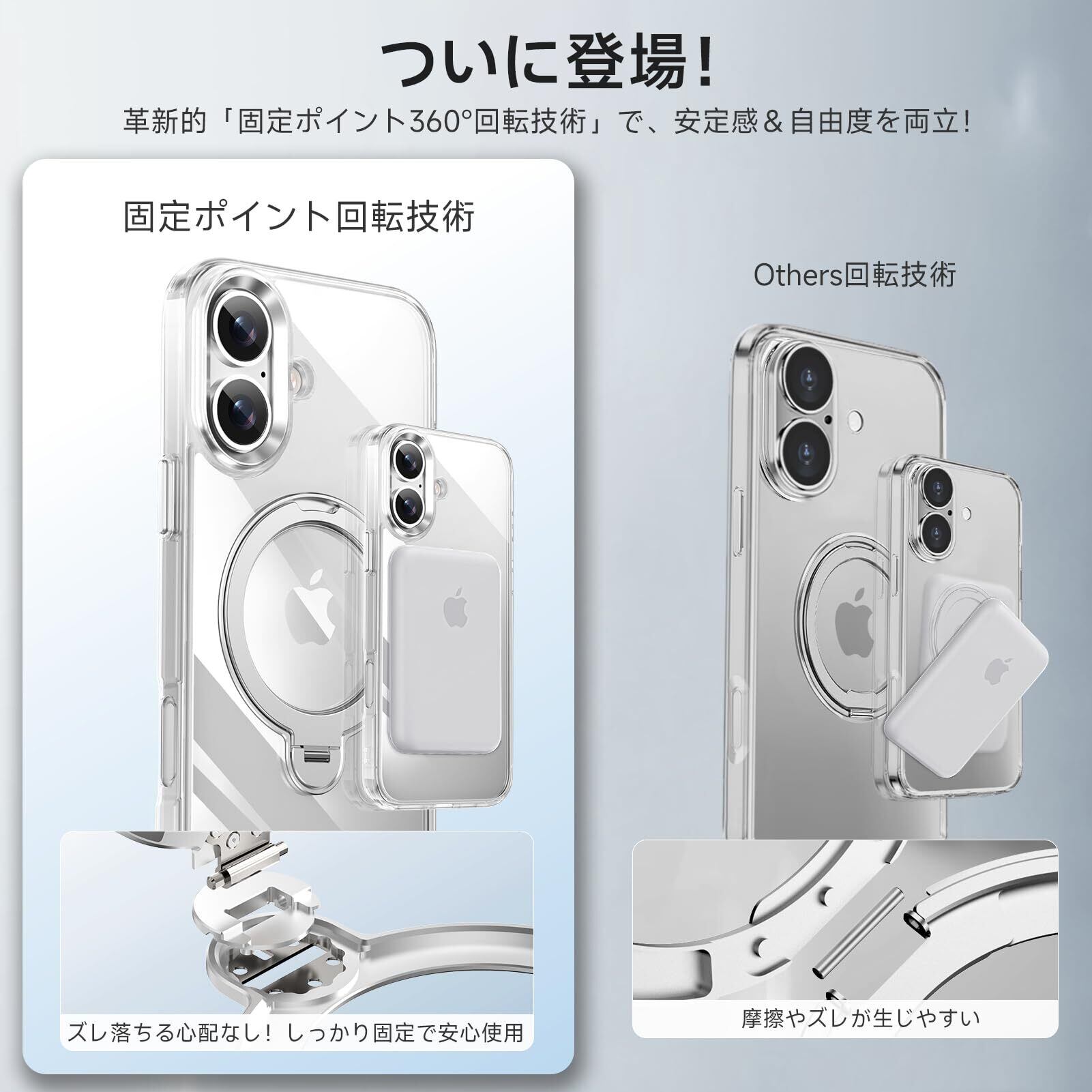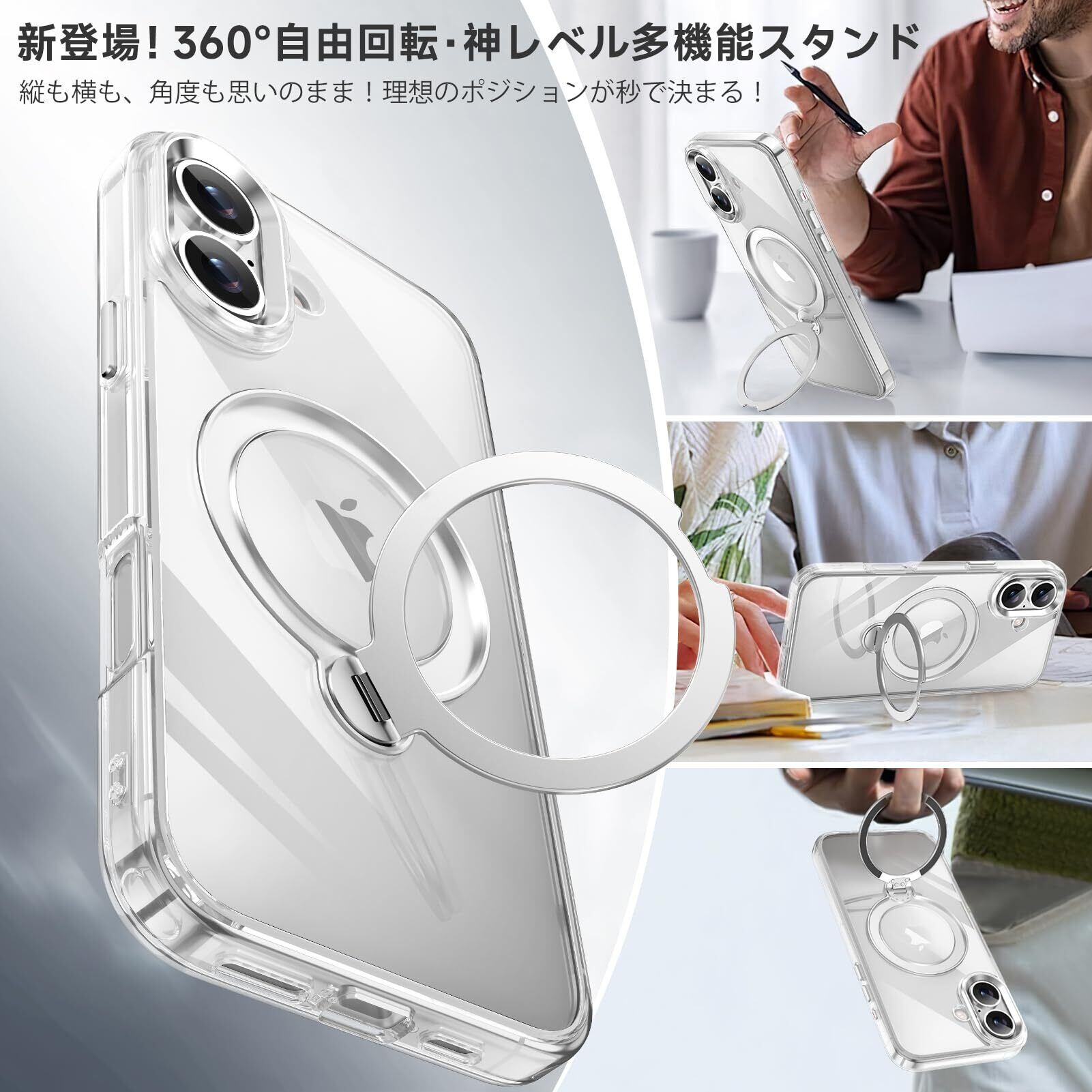 【透き通る上質感・多機能360°回転スタンド】KMAMBNG iPhone 16 用 ケース Magsafe対応【耐衝撃・金属感・真空メッキ・黄変防止・ストラップホール付き】縦横両立 角度自在 調整可能 磁吸機能でワイヤレス充電対応 おしゃれ スマホケース (クリア, iPhone 16)