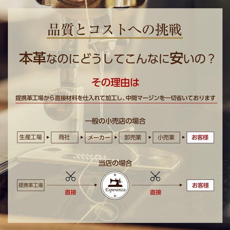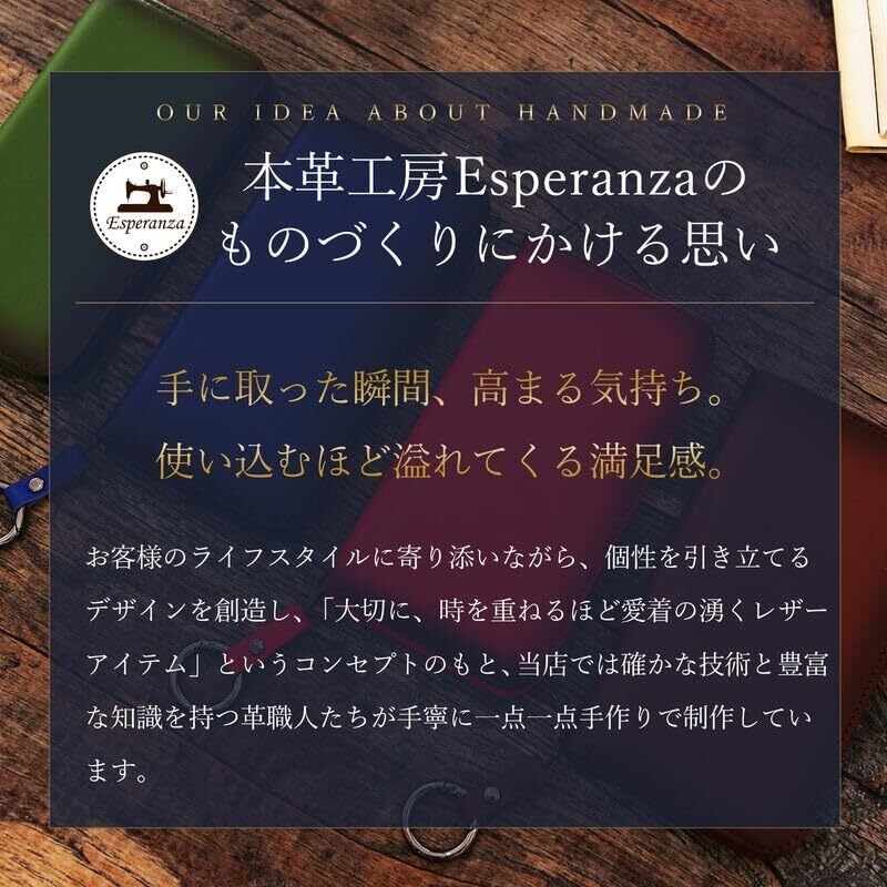 【本革工房Esperanzaの思い】 手に取った瞬間、高まる気持ち。使い込むほどに溢れてくる満足感。本革工房Esperanzaでは、お客様のライフスタイルに寄り添いながら、「大切に、時を重ねるほど愛着の湧くレザーアイテム」というコンセプトのもと、確かな技術と豊富な知識を持つ革職人たちが丁寧に一点一点手作りで制作しています。また、たくさんの人へのこだわりの詰まった革商品を手に取ってもらたい。その思いを胸に、日本人専属デザイナーが規格・デザインまでを行い、中間業者を一切省くことで、厳選された本革素材でありながら、徹底してコストを抑えました。
