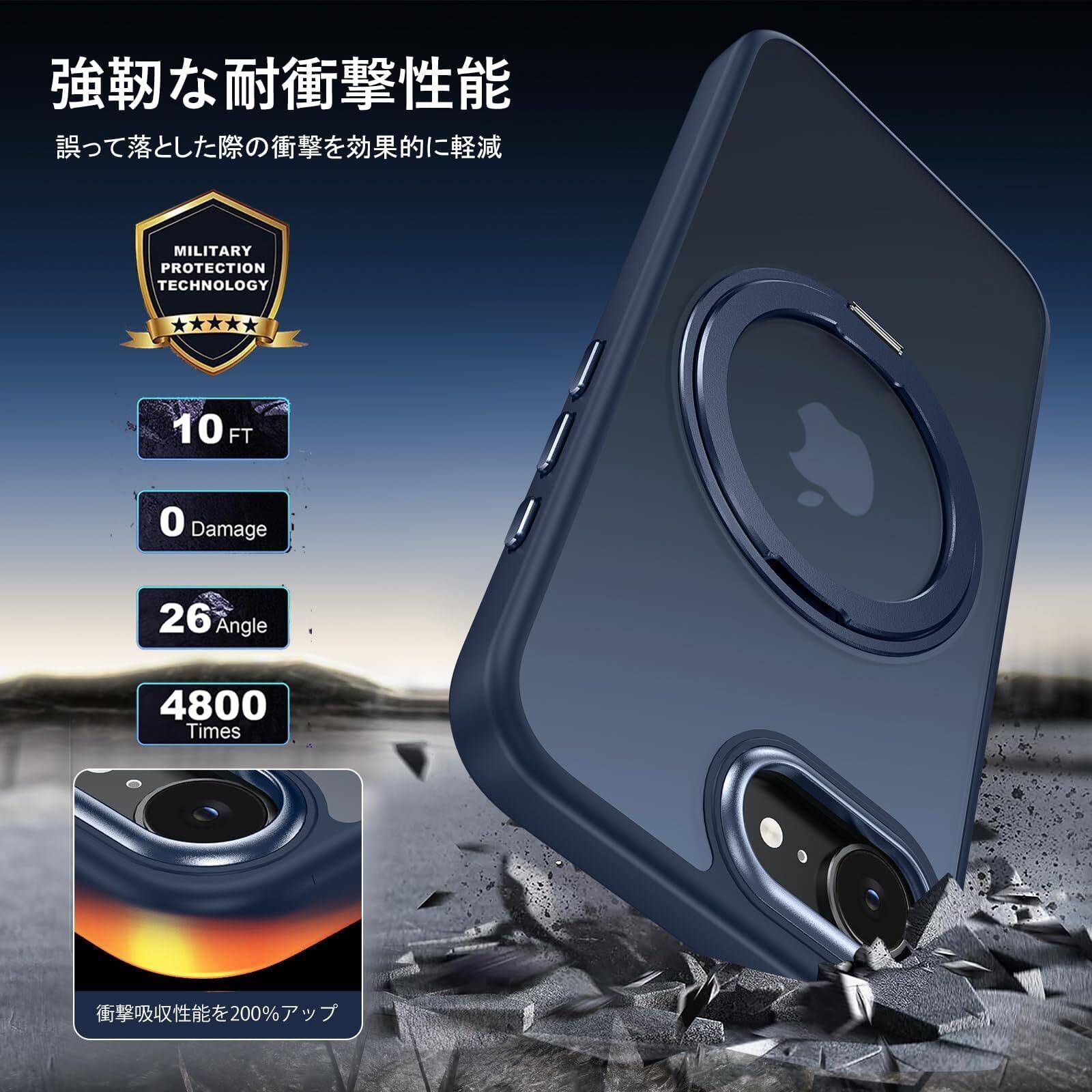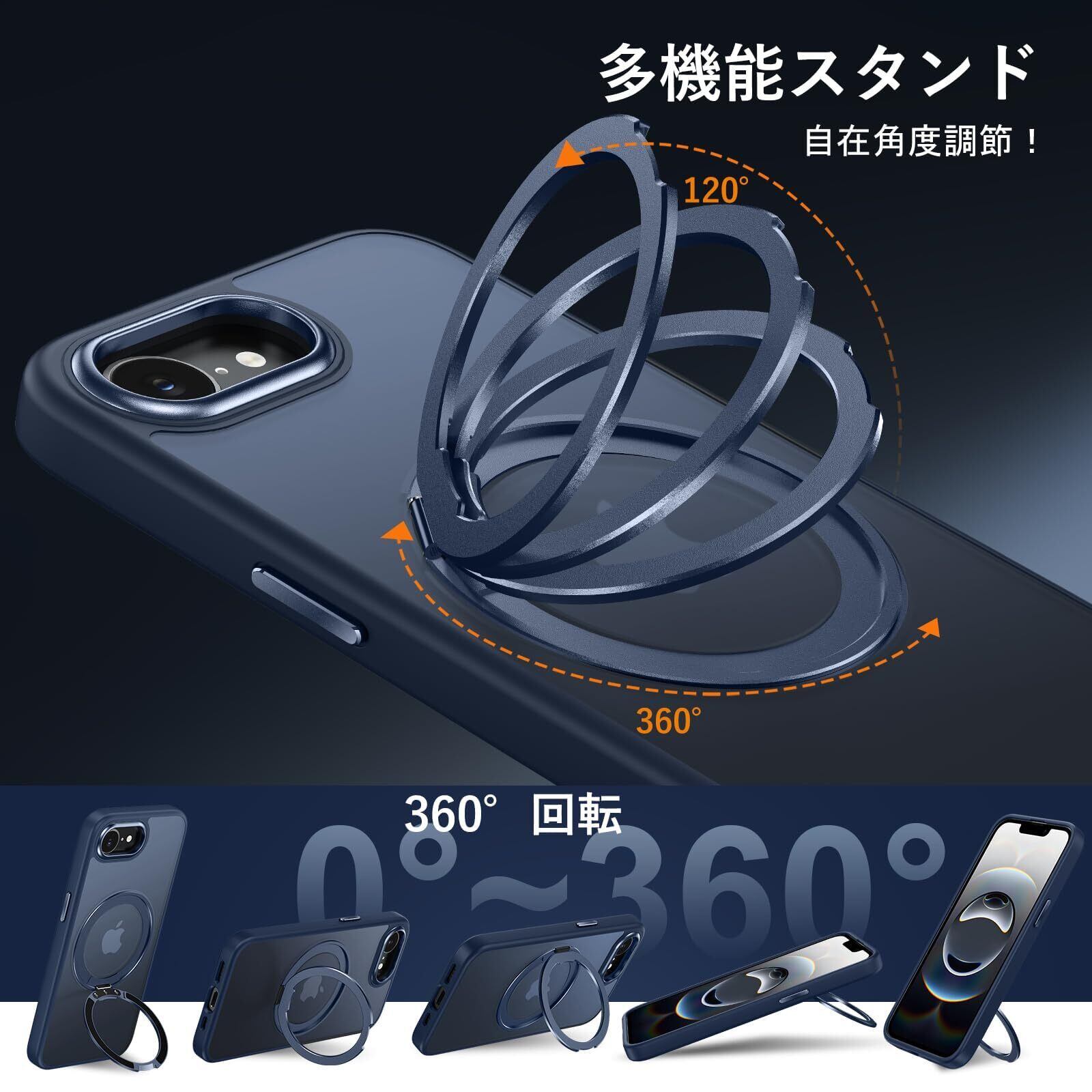 iPhone 16e 用 ケース Magsafe対応 360°回転スタンド アイフォン16e カバー リング マグネット搭載 ワイヤレス充電 縦横多角度 対応 Uovon アイホン16e スマホケース 車載ホルダー ストラップ穴付き マット 半透明 指紋防止 黄变防止 米軍MIL規格 ・ ブルー