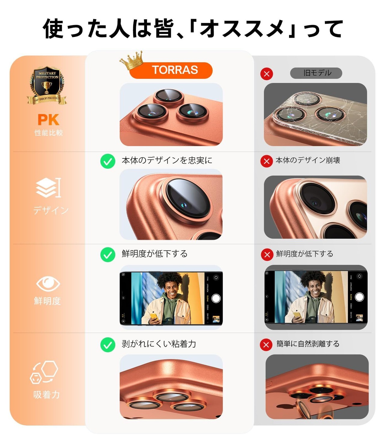 【宇宙規格の強度!大切なカメラを守る】米軍規格を超える耐衝撃性能を誇るTORRASのカメラ保護フィルムは、日常のあらゆるシーンで大切なカメラレンズを守る。電車内の落下やバッグ内の衝突からカメラを防護。航空技術を応用したイオン交換処理で硬度9H超を実現し、鍵やモバイルバッテリーとの接触でも傷を寄せ付けません。10年の技術蓄積と9600万枚の実績が、あなたの「もしも」に寄り添います。(For iPhone 17 Pro /17 Pro Max カメラ保護)