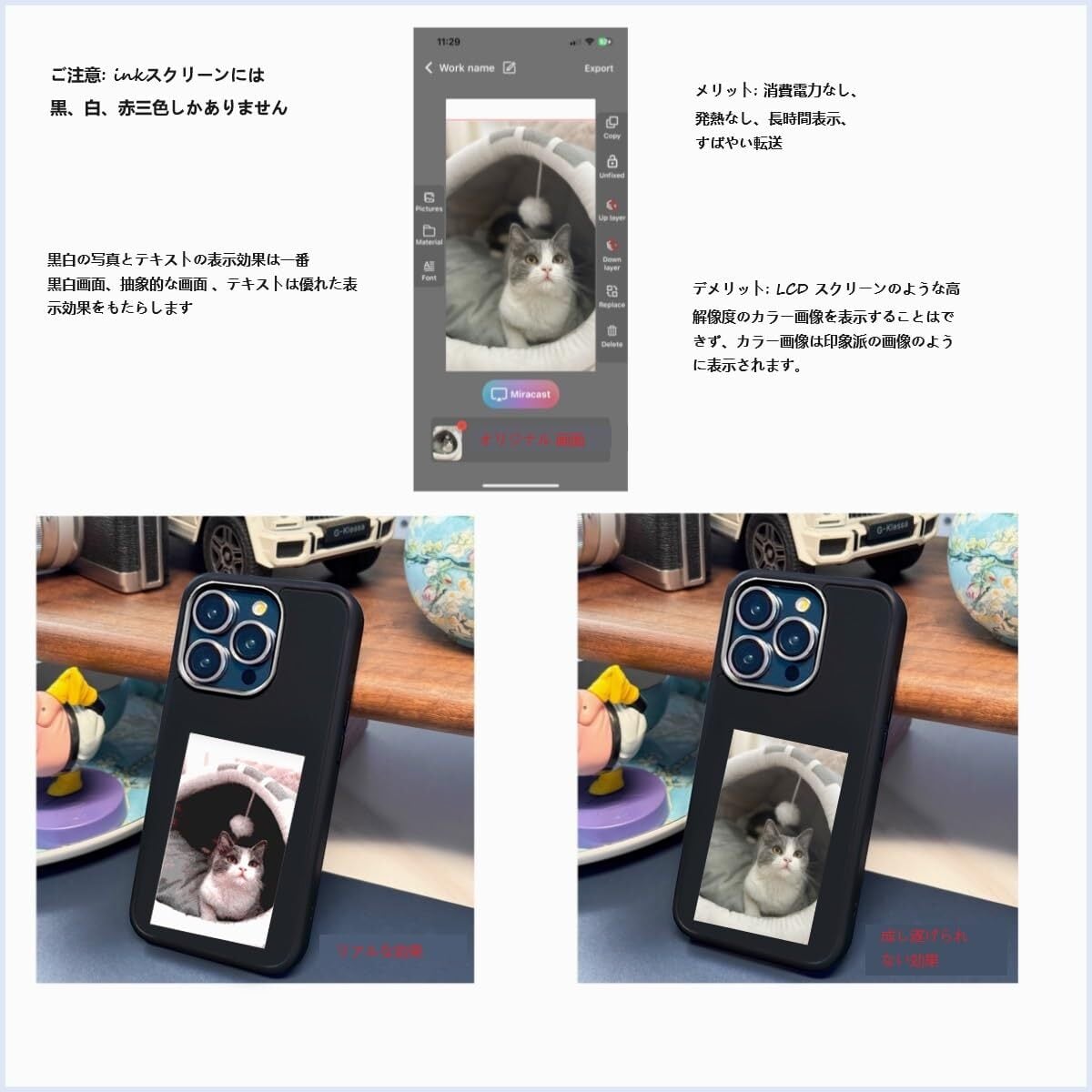 【新技術の応用】NFC技術により、ケースのスクリーンにカスタマイズされた画像を直接転送することができます。省エネのInkスクリーンは、画面表示に電力を一切消費していません。スマホの電源をオフにしたり、ケースを取り外したりした場合でも、画像は永続的に表示されます。