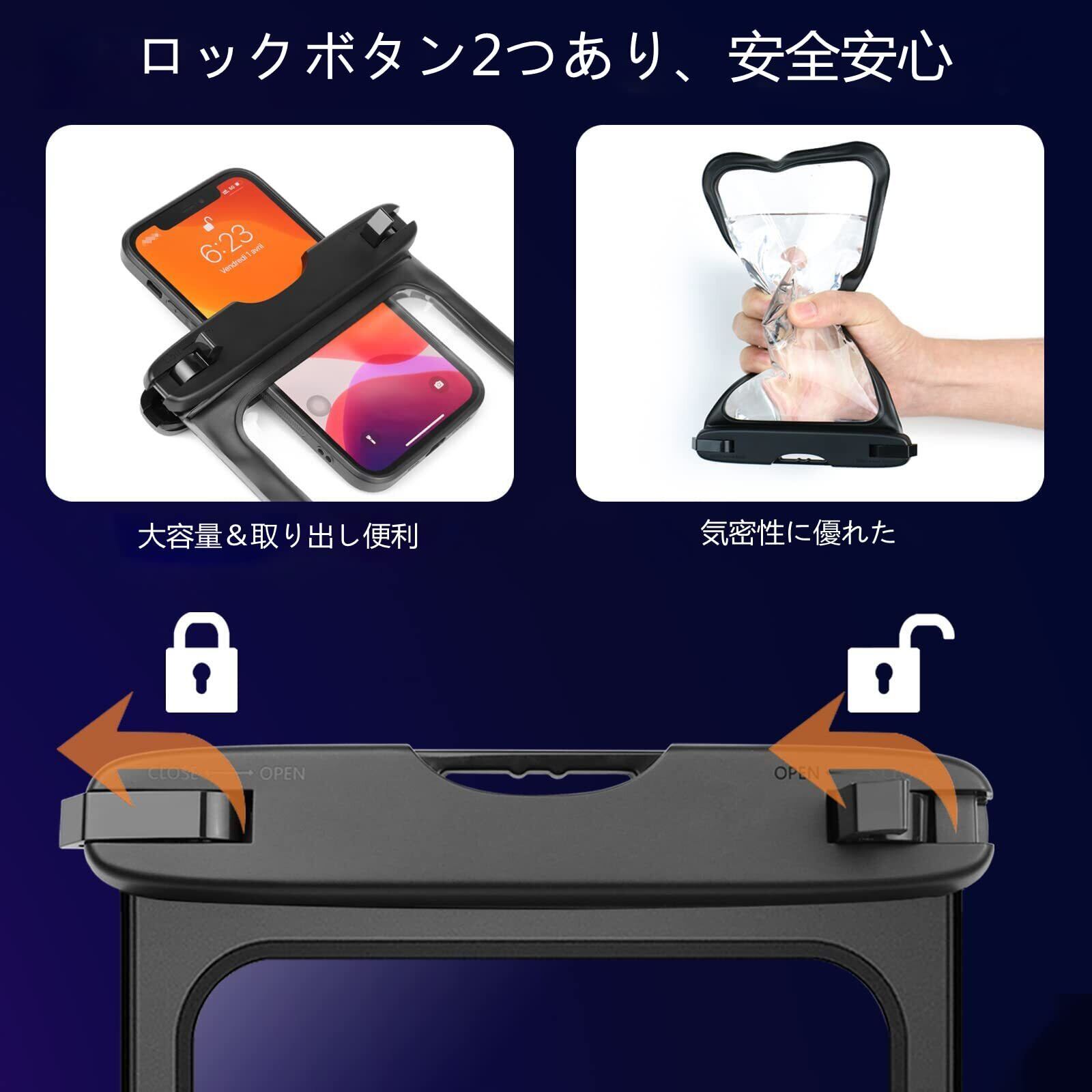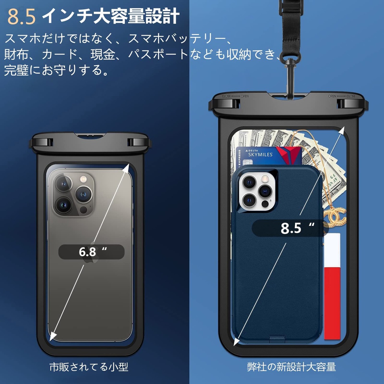 「2枚セット 大容量」LILIYYA スマホ ケース 大きめ IPX8 iPhone 防水ポーチ 海 プール お風呂 水中撮影 顔認証 タッチ操作 携帯防水ケース 首かけ 海水浴 ダイビング 釣り iPhone 15 14 plus pro promax 13 mini 12 11 プロ マックスse Xperia に対応 8.5インチ 黑 | kki