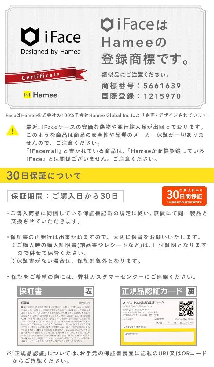 ●本製品ご使用における人体・スマートフォン本体を含む持ち物・データなどの損傷、損失、紛失に対し、は一切の責任を負いかねます。●スマートフォン本体やケースに発熱などの異常がある場合は本製品を外してください。●画面保護フィルムの形状により本製品と併用できない場合があります。●背面カメラでの撮影時に写り込みが起こる場合があります。●本製品はケース背面がシリコン素材のため、iFaceスマホリングなどを貼り付けてご使用することはできません。●ご使用の充電器や環境によってワイヤレス充電がご利用いただけない場合があります。●ご利用状況・環境、溶剤の使用などにより変色や変質が起きることがあります。●本製品装着やOSアップデートにより、スマートフォンの一部機能が使えなくなる可能性があります。●本製品およびパッケージは改良のため予告なく仕様を変更する場合があります。●記載されている製品名・会社名などは各社のまたは登録です。●ストラップホール部の透明パーツは衝撃緩和のため取り外さずご使用ください。●小さな部品がありますので誤飲にご注意ください。