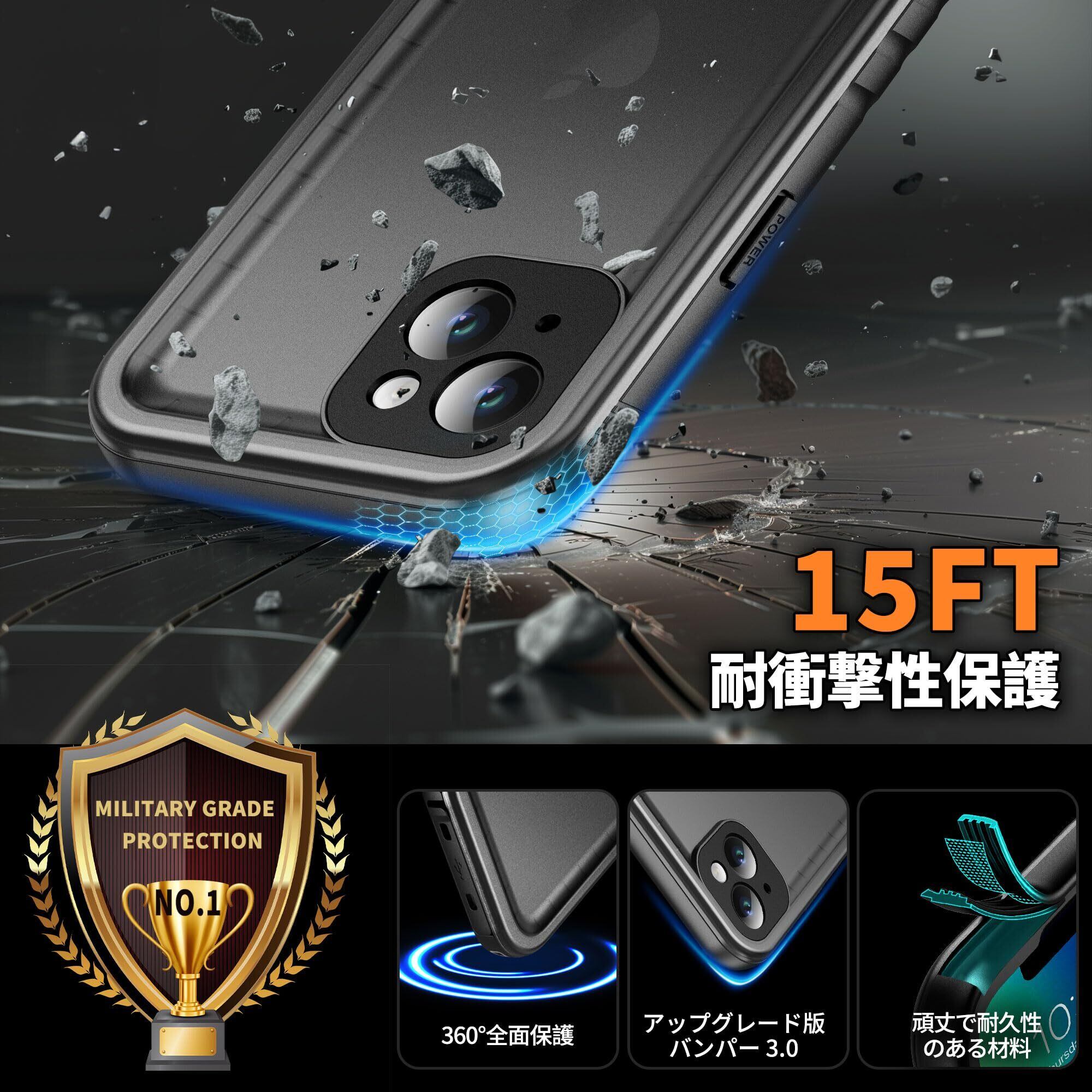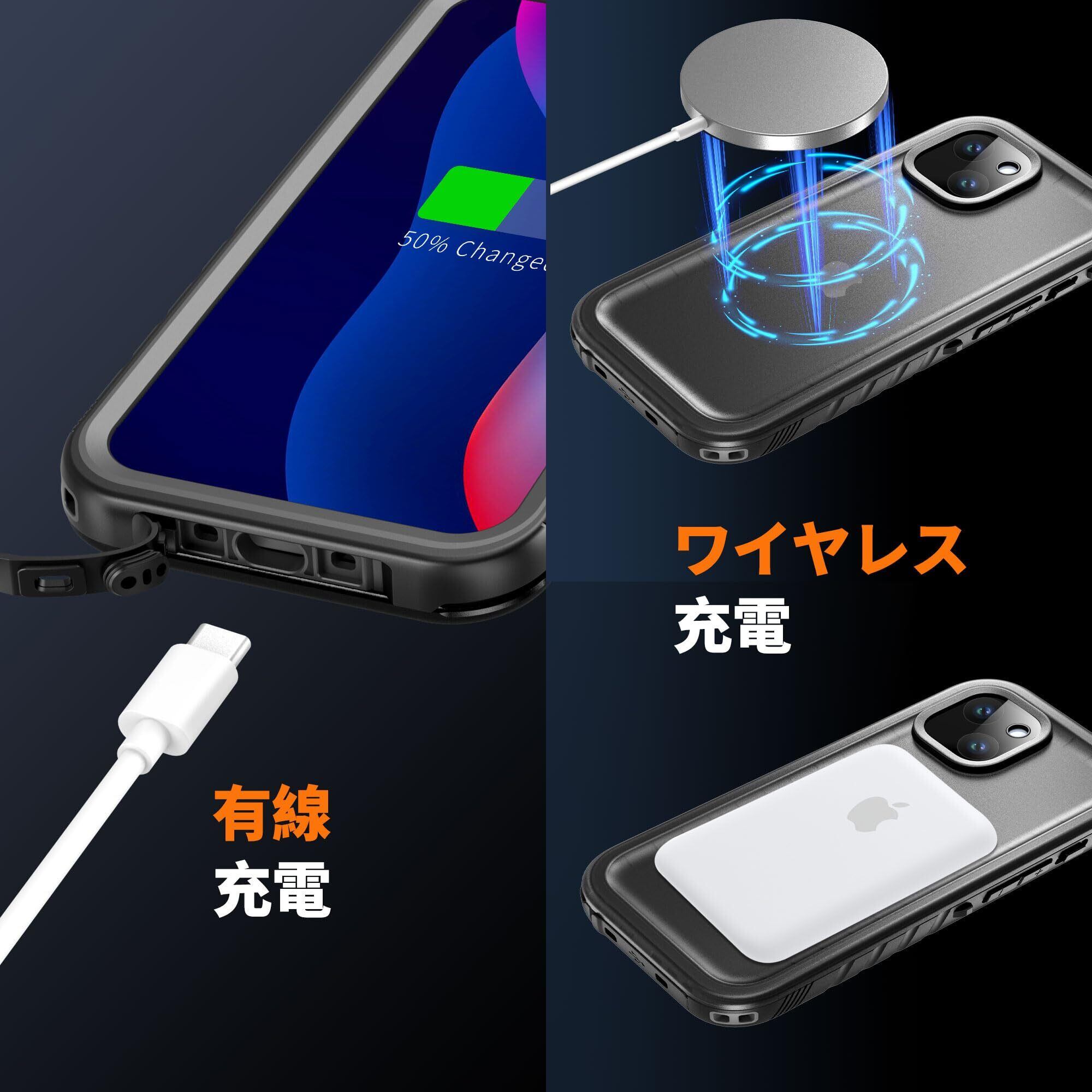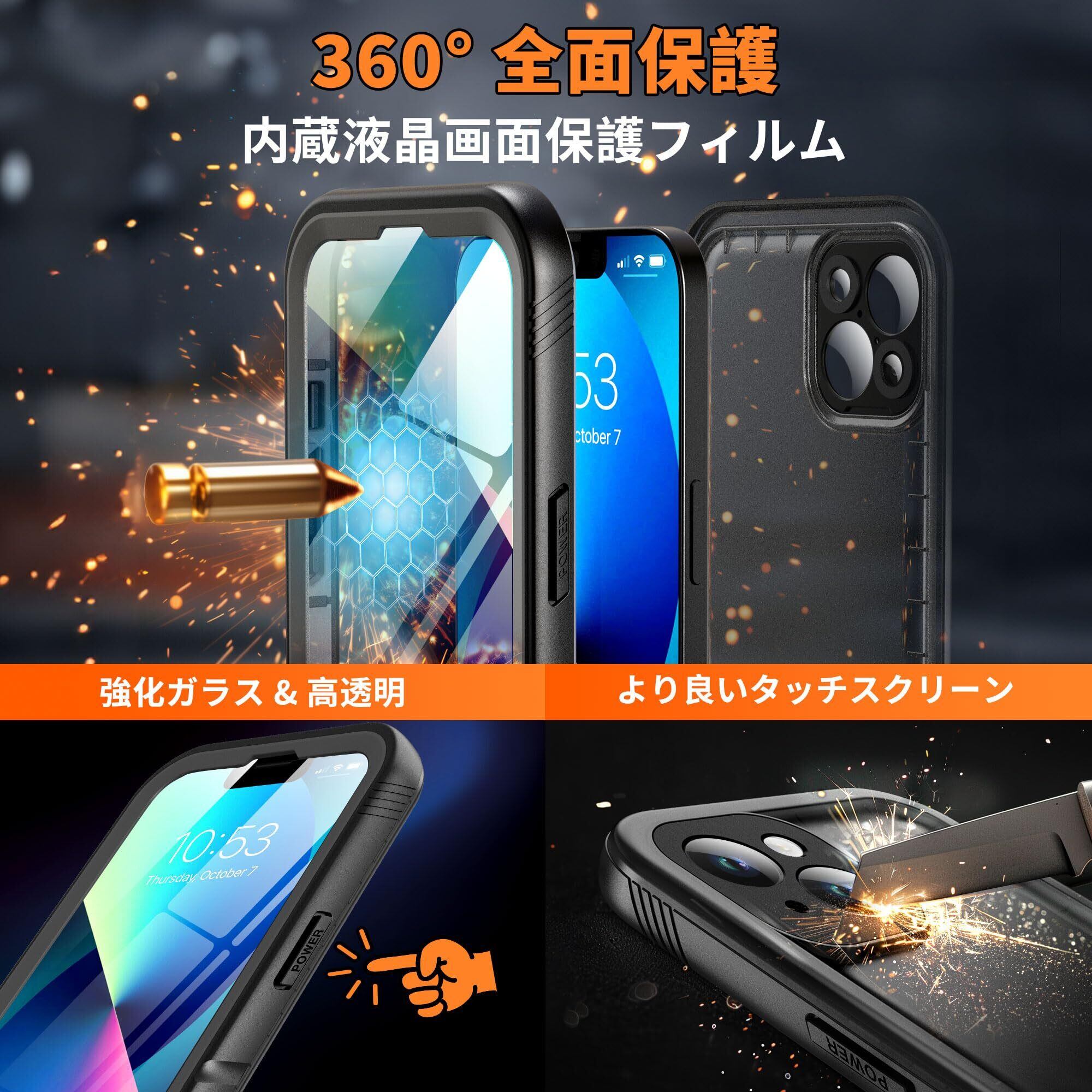 【画面保護機能 & クリアなサウンド】- 新型PETから作られた内蔵スクリーン保護フィルムは擦れにくくタッチスクリーンが良く、3mの高さから落下した際に破裂することがなく、四角枠にもバンパーが付属し、保護を提供しています。強化ガラスフィルのように割れません。充電ポート付近はA+級透音膜などの特殊設計を採用し、通話、映画、音楽効果は他の360度両面ケースや防水ケースよりも優れています。