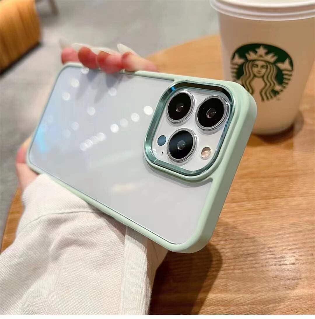 iPhone15 ケース ストラップホール付き クリア 透明 カバー 2色 配色 薄型 可愛い レディース アイフォン15 カバー 背面ケース ハードケース (iPhone15, 薄緑)