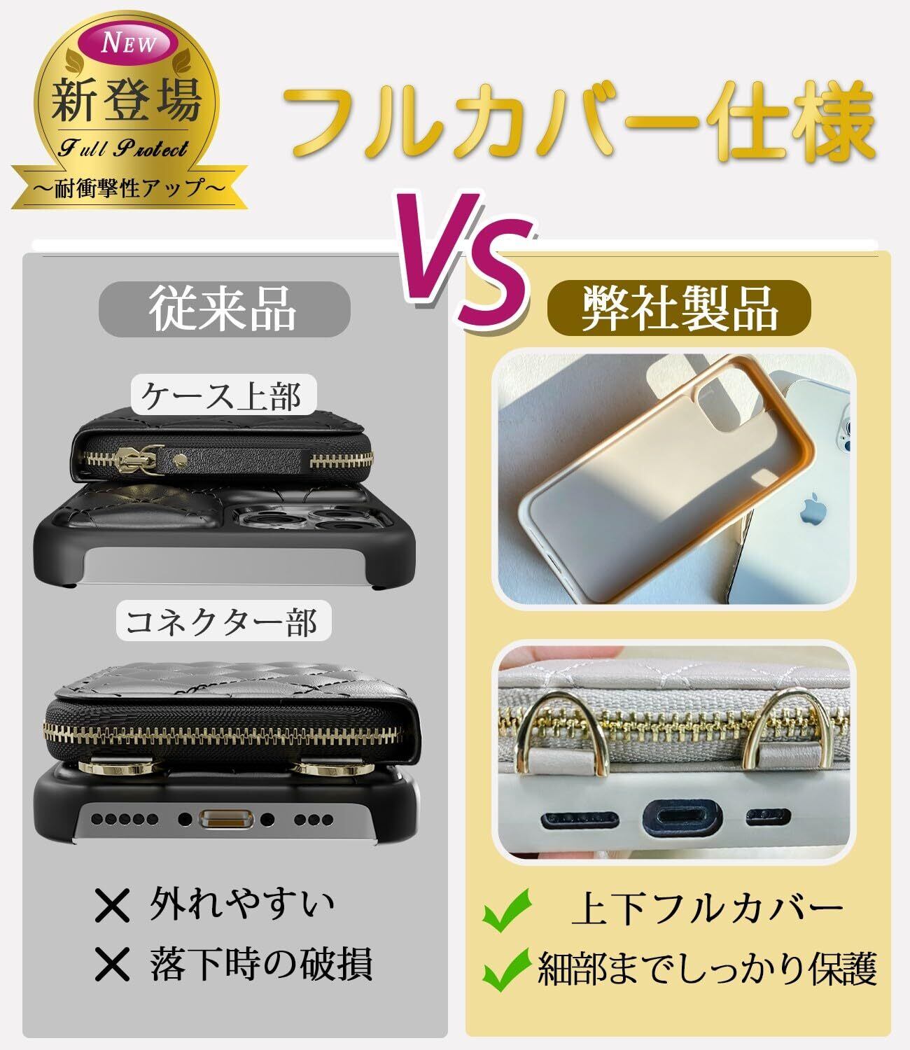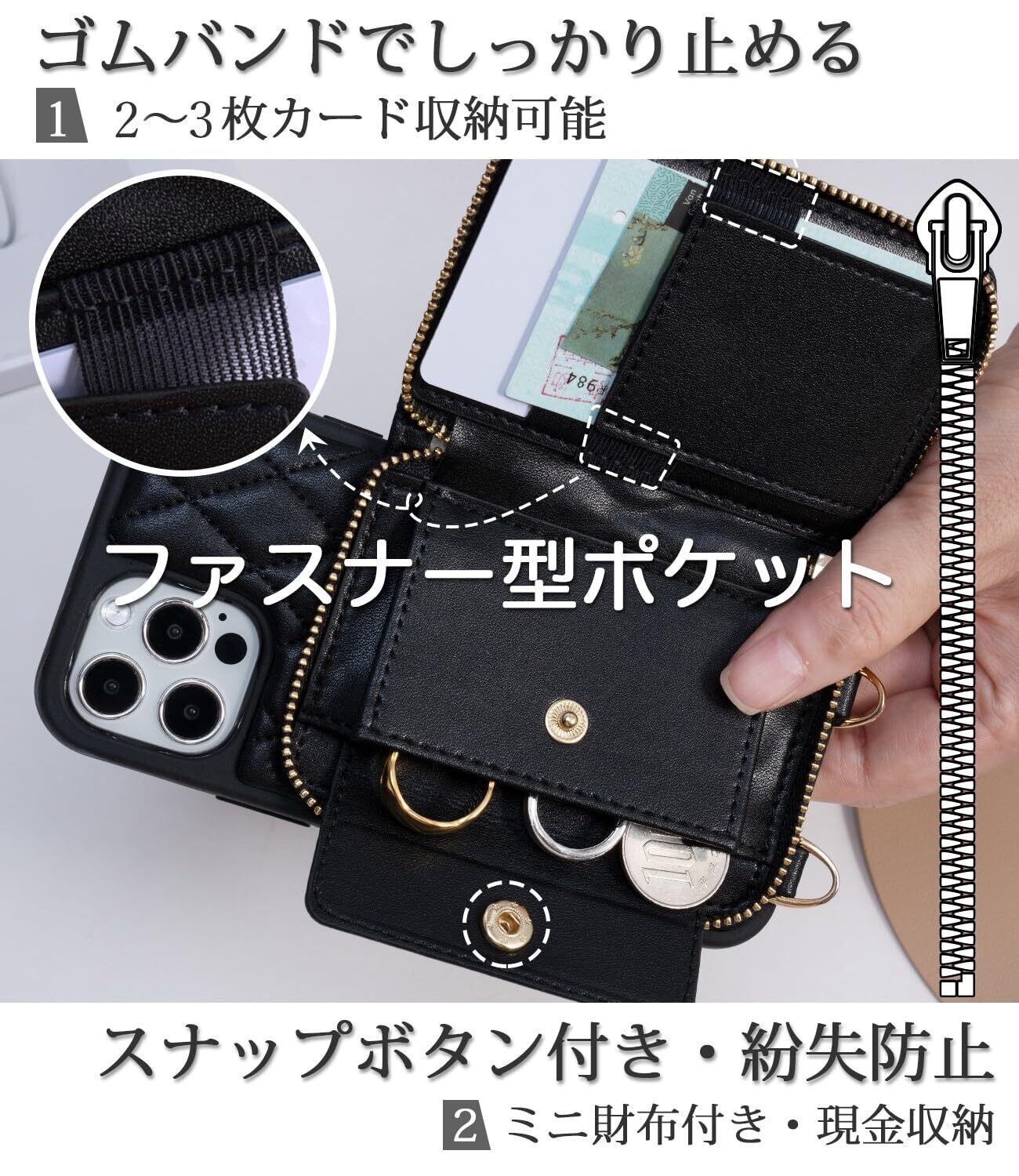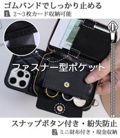 【財布一体型・スマホケース13 ケース】機能性とデザイン性を兼ね備え、ファスナー式 財布付き ショルダー スマホケース。コンパクトで収納力があり、カード入れ・小銭入れ・札入れ・ICカード入れ・名刺入れ、多機能を実現。高品質ファスナー採用、背面ポケットがコ字型に大きく開け、物を出し入れしやすい。左側にコインケースがある。スナップボタンで留めて、コインやアクセサリーの落下をしっかりガード。右側にカード2~3枚が収まるスロットが付き。1か所にゴムバンドが付く為、札、鍵など厚みのある小物もしっかり固定可能!