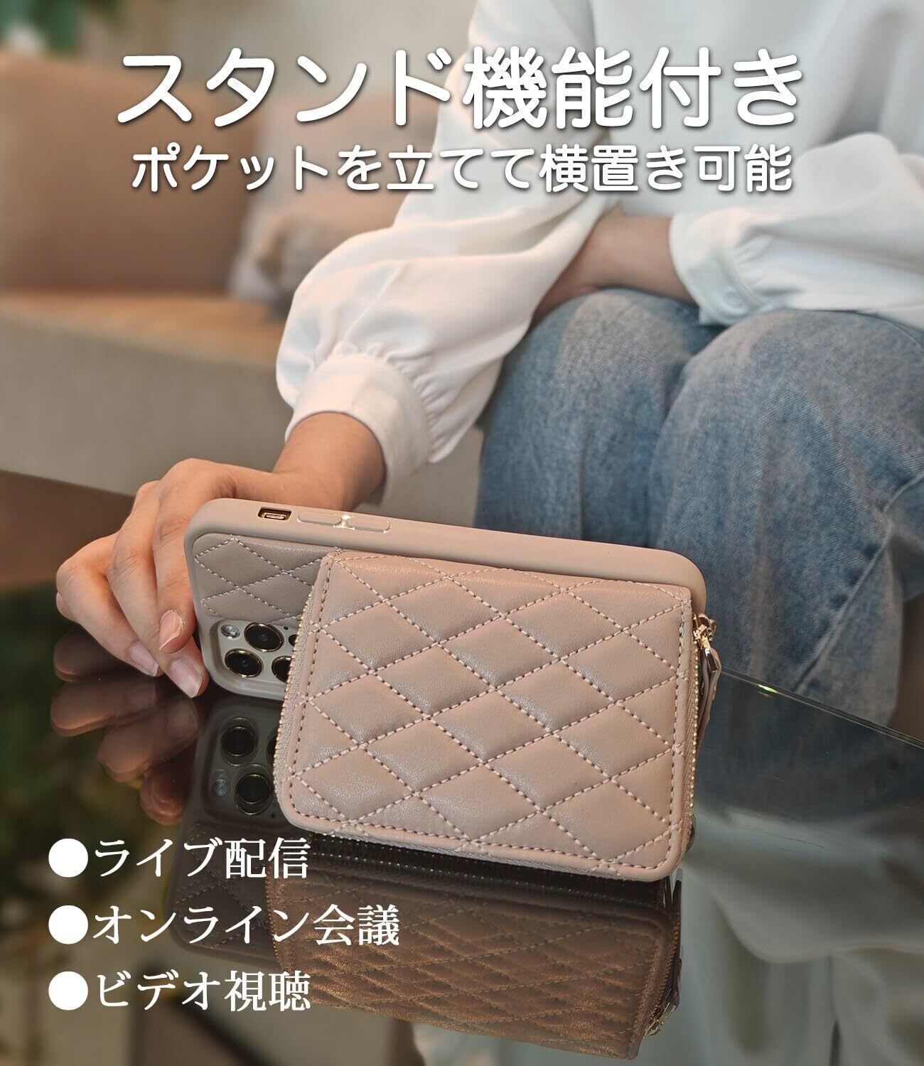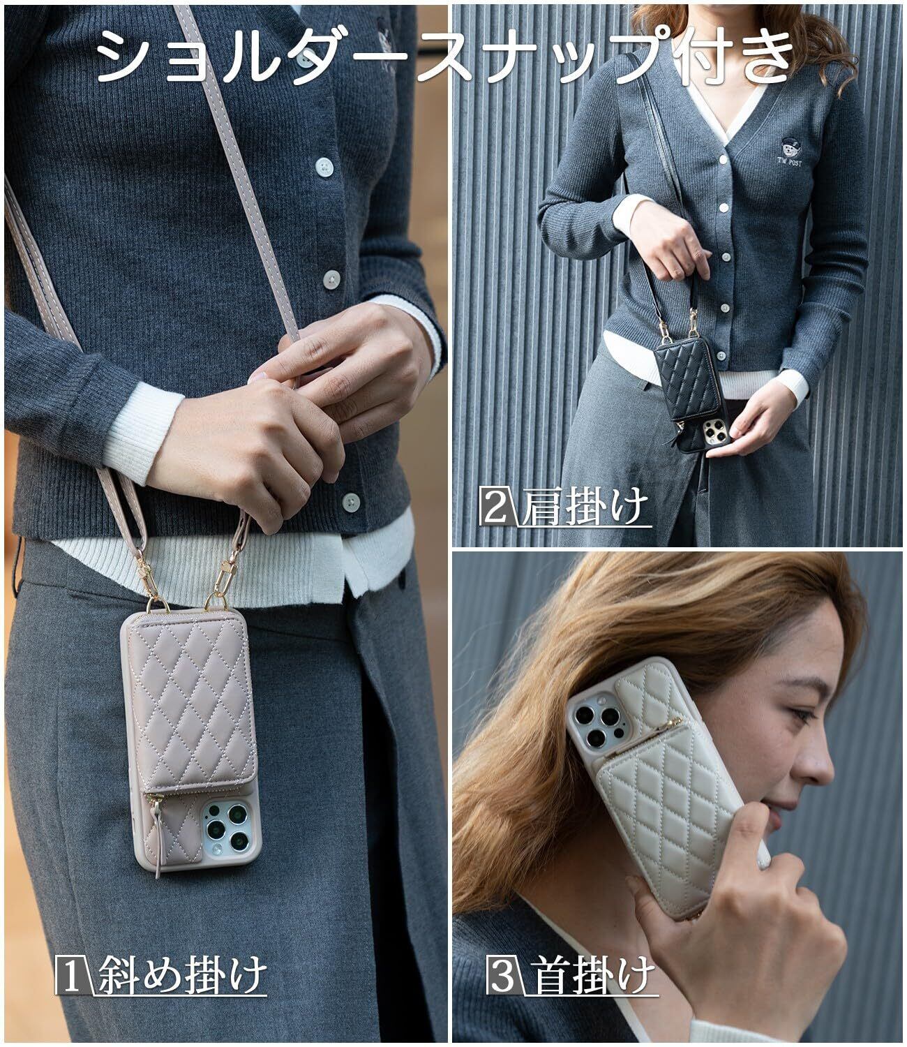 【おしゃれな スマホケース 13】高品質PUレザーを採用し。キルティン製法により、ひし形のチェック柄を作って、しなやかで柔らかいタッチ感とふんわり弾力感が共存。エレガントなゴールデントーン金具使用。リングやファスナーがキラキラと輝いて、おしゃれなアクセサリー感覚でお手元のスマホケースを彩る。全3色展開。落ち着いた色味ながら、お洋服にも合わせやすい。ご自身用はもちろん、お友達のお誕生日プレゼント、母の日のギフトなどにもおすすめ。