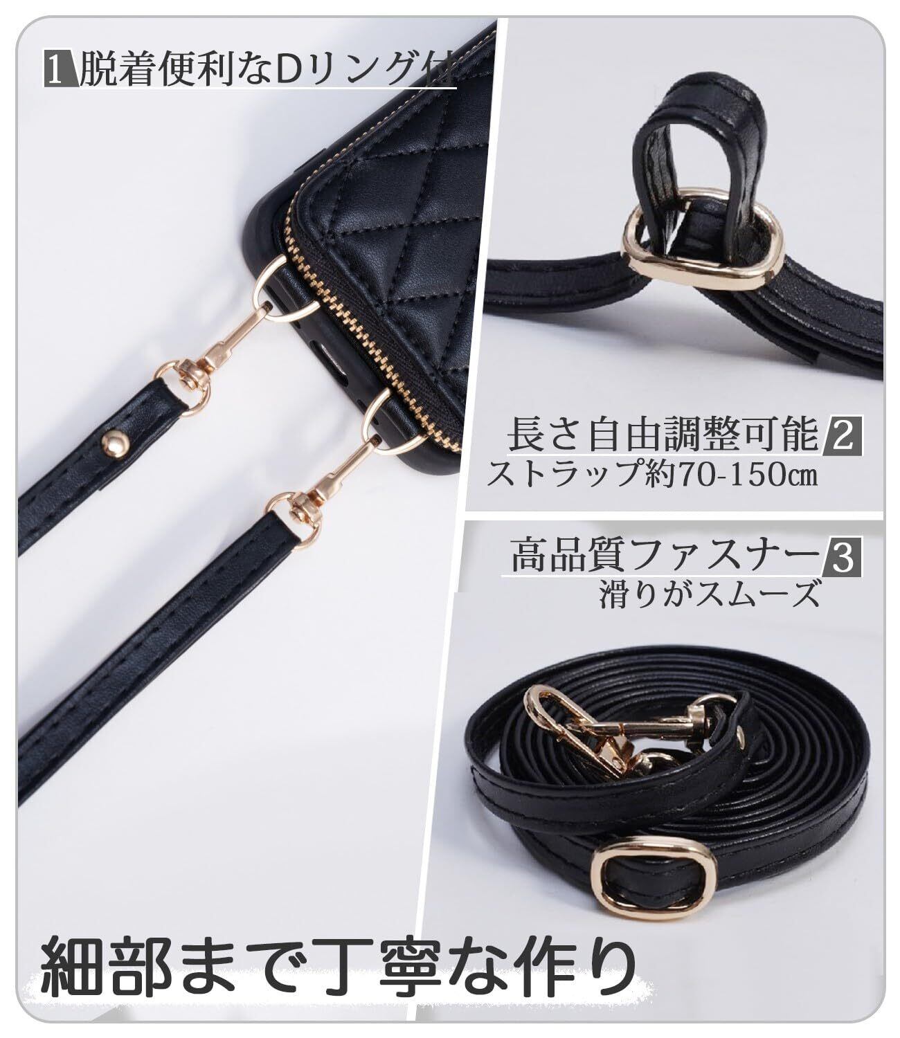 【13ケース ショルダー ストラップ付き】ショルダーベルト全長は約70~140cmまで調節可能。外出先で両手が空かない時、ケースを肩や首にかけて使用できる。様々なのシーンやスタイルに合わせてどこにでも持ち歩ける。特にポケットがないお洋服には最適!使い勝手が抜群。耐久性が高いDリングを採用。取付も取り外しも簡単。ストラップが不要な時には、携帯ケースのリングから簡単に取り外すことができる。他のお気に入りのストラップに交換することも可能。