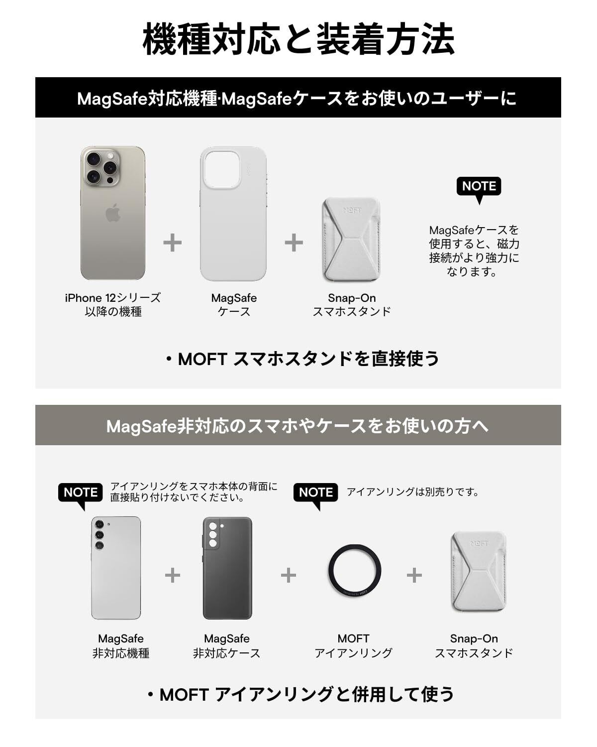 【アイアンリングと併用可能・全機種対応】iPhone 17 Pro Max/iPhone 17 Pro/iPhone Air/iPhone 17/iPhone 16 Pro Max/iPhone 16 Pro/iPhone 16 Plus/iPhone 16/iPhone 15 Pro Max/iPhone 15 Pro/iPhone 15 Plus/iPhone 15/iPhone 14 Pro Max/ iPhone 14 Pro/iPhone 14 Plus/iPhone 14/iPhone 13 Pro Max/iPhone 13 Pro/iPhone 13/iPhone 13 Mini/iPhone 12 Pro Max/iPhone 12 Pro/iPhone 12/iPhone 12 Mini 全シリーズに対応できます。背面にマグネットが付いていないスマートフォンも、アイアンリング(別売り)をスマートフォンケースに取り付けるだけで使用できます。 取り付け方法については、詳細ページをご参照ください。【注意:粘着面がある側はスマホケースまたはスマホの背面に貼り付けてください。スタンドには貼り付けないでください。】