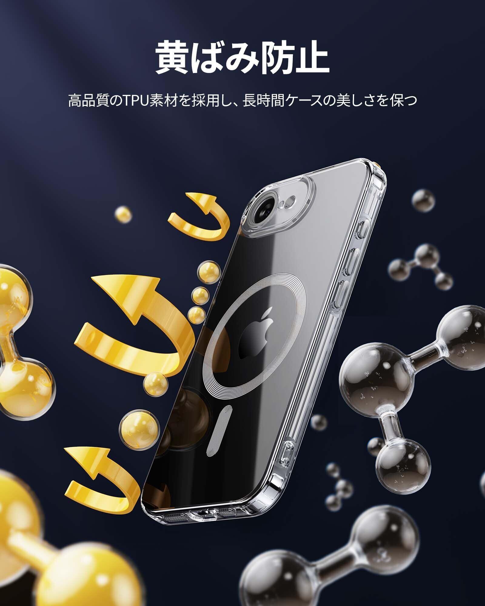 【黄変防止】高品質のTPU素材に抗黄変因子を加えることで、黄変防止性能を大幅に向上させ、長期間使用しても光沢感と透明感を維持します!洗練されたクリアデザインで、iPhone 16eの美しさを完璧に再現します。