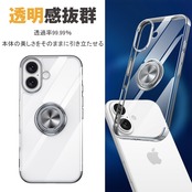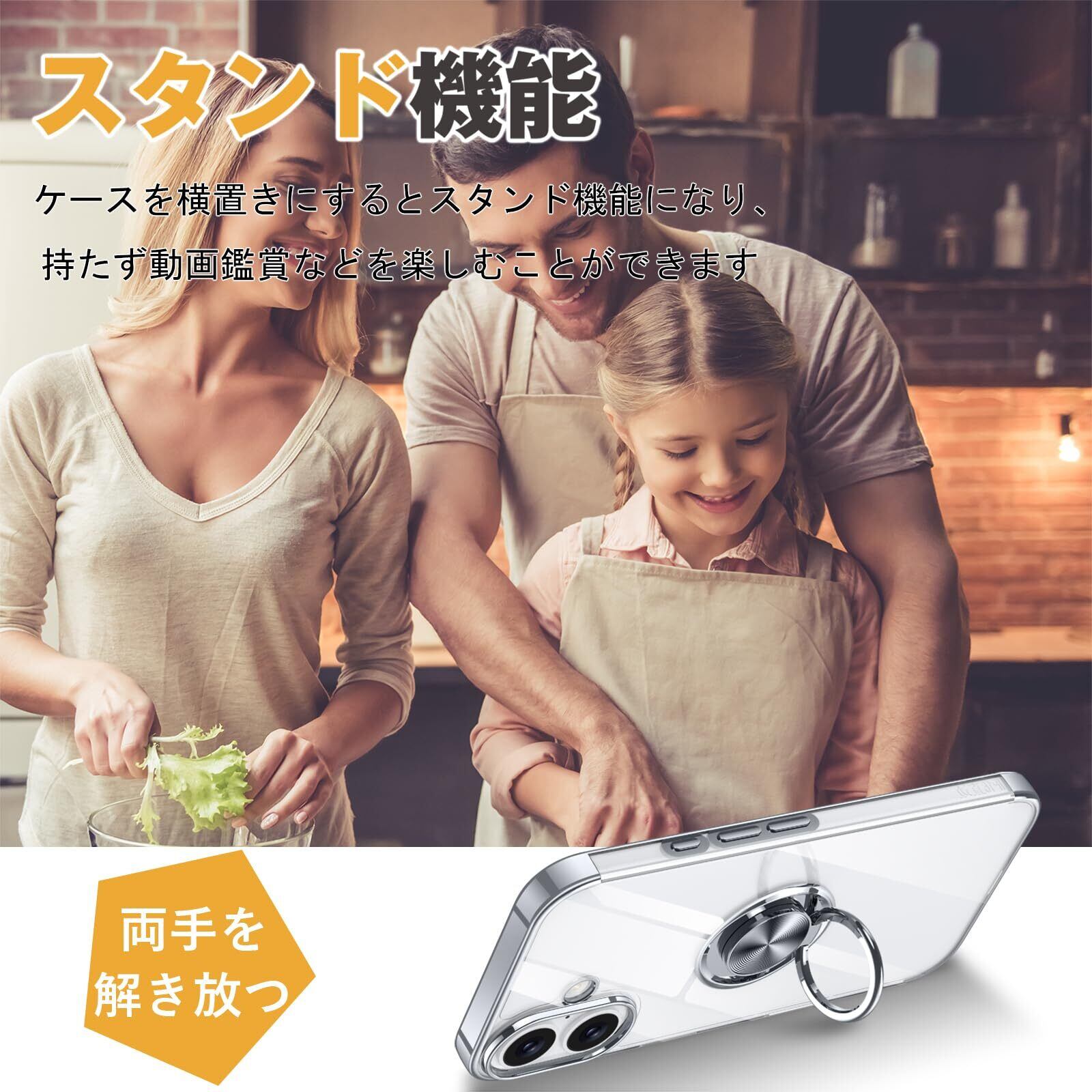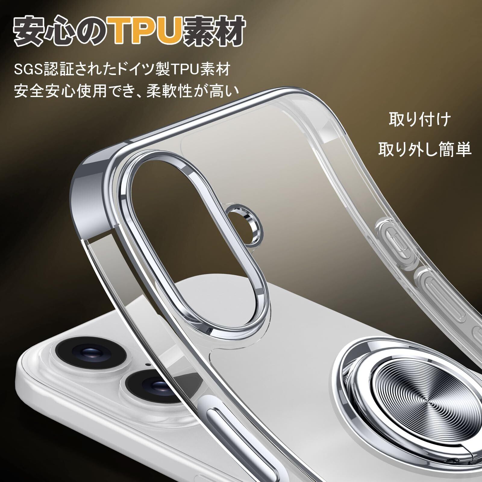 iPhone 16 適用 ケース クリア リング付き アイホン 16 カバー 透明 おしゃれ OURJOY スマホケース メッキ加工 ソフトケース 耐衝撃 軽量 薄型 ストラップホール付き スタンド機能 車載ホルダー対応 携帯ケース・シルバー