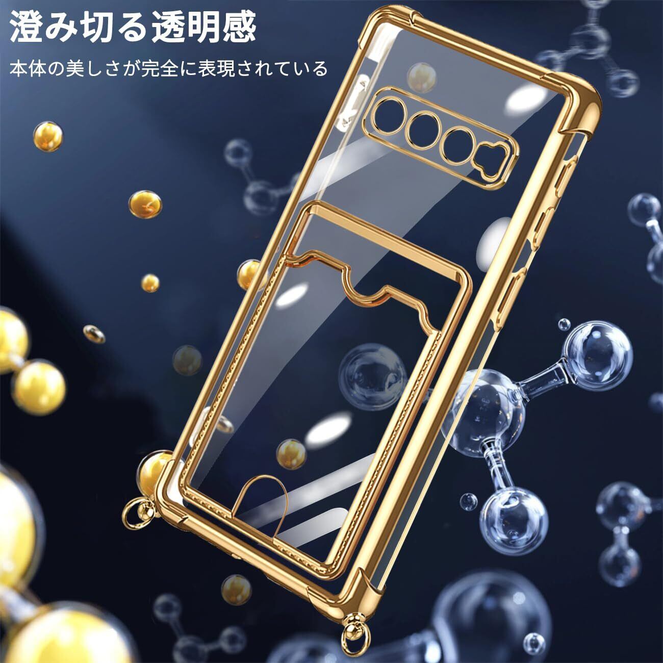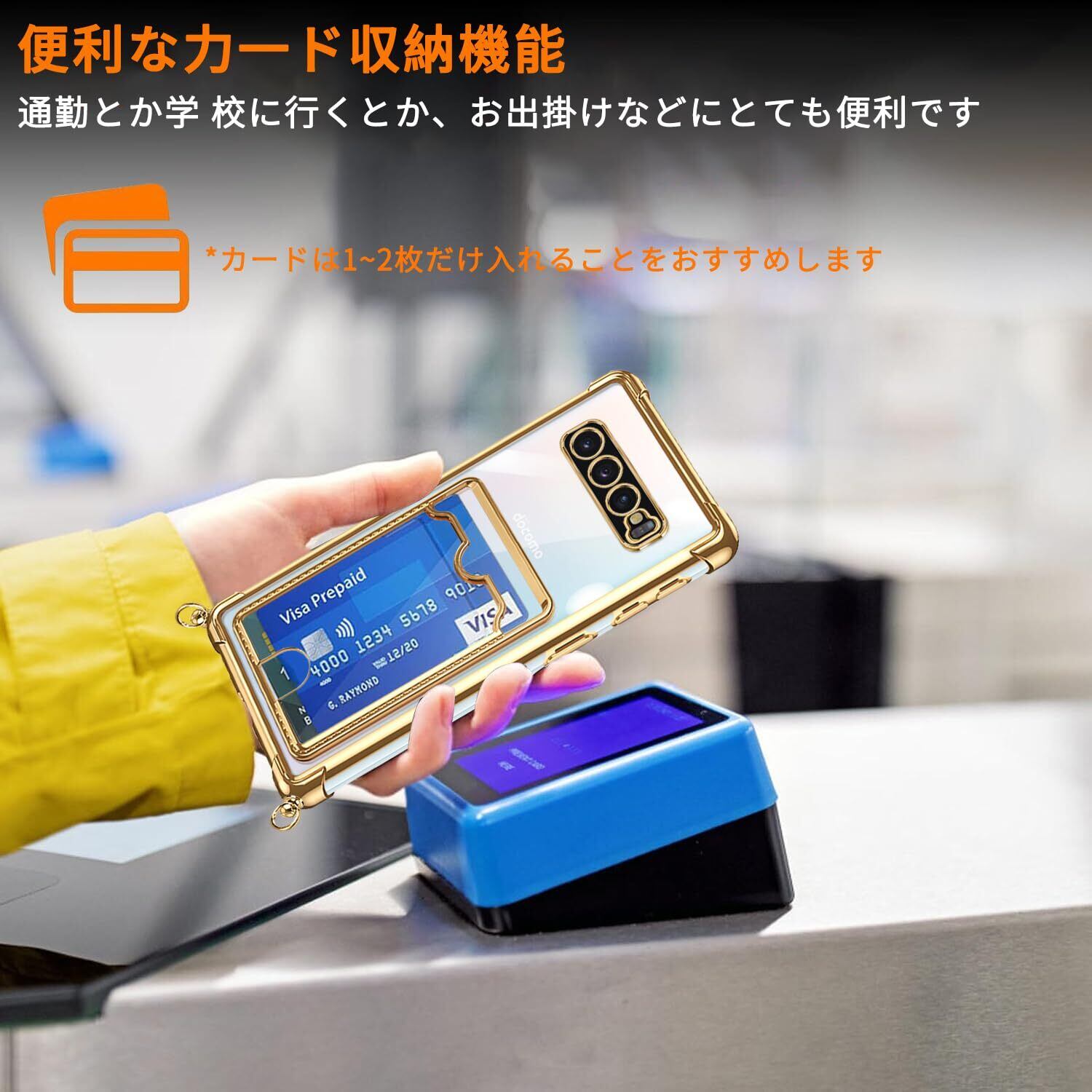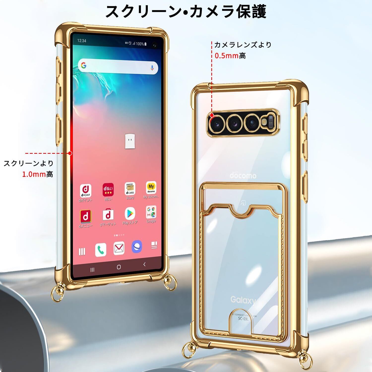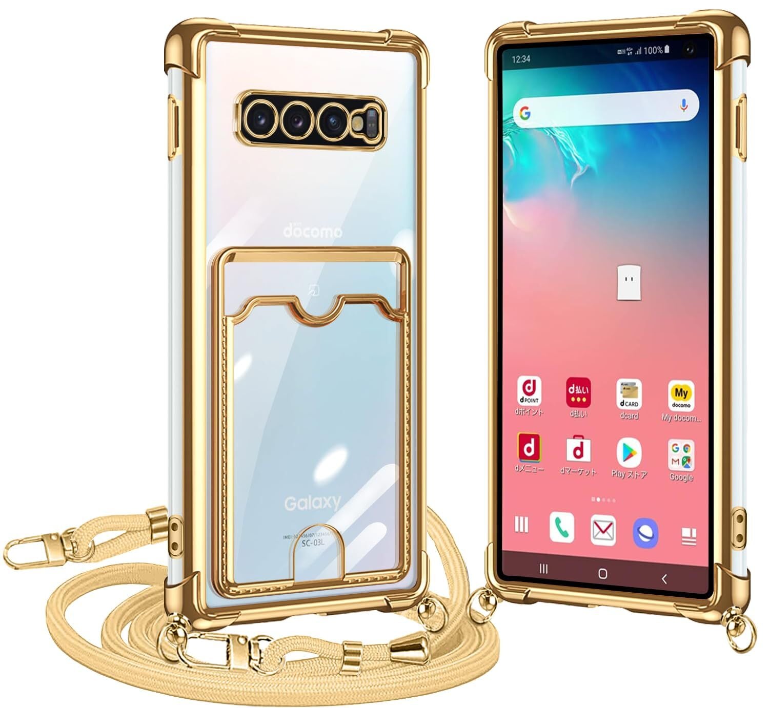 Galaxy S10 ケース SC-03L SCV41 ケース クリア ショルダー galaxy s10 カバー カード収納 ギャラクシーs10 スマホケース 肩掛け 首かけ 斜めがけ 縄掛け ケース 透明 TPU 耐衝撃 薄型 軽量 カード入れ 財布型 スマホケース 調節可能な 落下防止 紛失防止 (ゴールド)