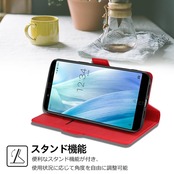 【特徴2】:スマホを横置きにしての視聴は不可欠なので、本ケースはスタンド機能が付きます。横向いて斜めに立てて両手を解放し、お気軽に読書やビデオの観賞を楽しむことができます。