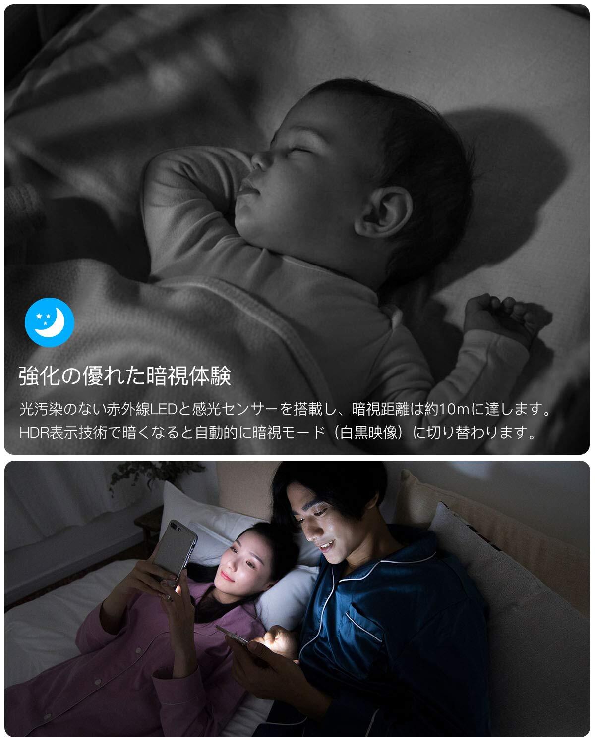 「5Gwifi対応・双方向通話・暗視撮影」 最新のチップを採用し、2.4Gwifiだけでなく5Gwifiにも対応しています。ネットワーク接続がスムーズで、携帯電話やパソコン、電子レンジなどの電子機器との干渉も受けにくく、ネットワーク接続の問題を90%も解決しています。他メーカーの製品より四倍通信範囲を強化しています。カメラの周囲の音声を360度拾うことができる集音マイク&スピーカーを内蔵し、ノイズフィルタ技術を搭載され、遠隔地の海外でもスマホで子供やペットや老人に話しかけることができます。スマ一トIR-CUT技術により、昼と夜の明るさに反応して自動切り替え可能です。波長850nm赤外線LEDを内蔵、通常のカメラに比べてセンサ効果が3倍に向上し、暗視距離は約12mに達し、真っ暗な中でも鮮明に映像を映し出します。子供たちが寝っている状態を見えることはとても幸せです。プレゼントとして家族や友達にあげるのはいい選択です。