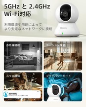 【2.4と5GhzWiFi対応・ご家族やペットを見守る】①水平方向360°、垂直方向110°のPTZ機能を付きます。手動でレンズを操作して、またはアプリで遠隔から向きを操作できます。4倍デジタルズームを搭載して、必要に応じてズームアップして細部を確認できます。②アプリに通して、リアルタイムで音声双方向通話も可能です。お子様のみまもりカメラ用・ペットの監視カメラ用・お年寄りの介護カメラ用・室内防犯カメラ用など様々なシーンで大活躍です。③microSDカードで24時間常時録画可能です(無料、最大128GB、microSDカードは含まれていません)。