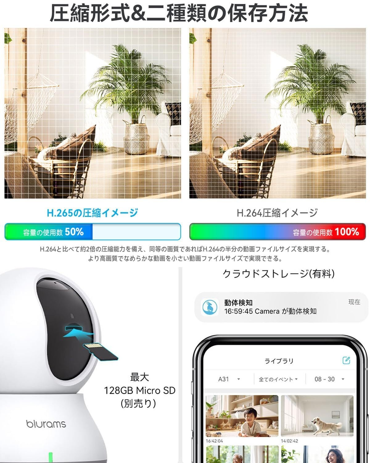 【接続簡単・2種類の録画保存方法】①日本語対応アプリで、指示に従うだけで初心者でも簡単に使えます。「blurams」アプリをダウンロードし、メールで登録・ログイン後、QRコードをスキャンするだけでデバイスが追加されます。追加後、wifi カメラのリアルタイム映像もすぐに確認できます。②録画保存方法はmicroSDカード(最大128 GB/別売り)や有料のクラウド保存です。本製品は、microSDカードやクラウドなしでも過去24時間の移動イベント(12 秒ぐらい)を記録でき、ほとんどの機能を実現できます。24時間連続録画したい場合は、microSDカードを挿入するのをお勧めいたします。