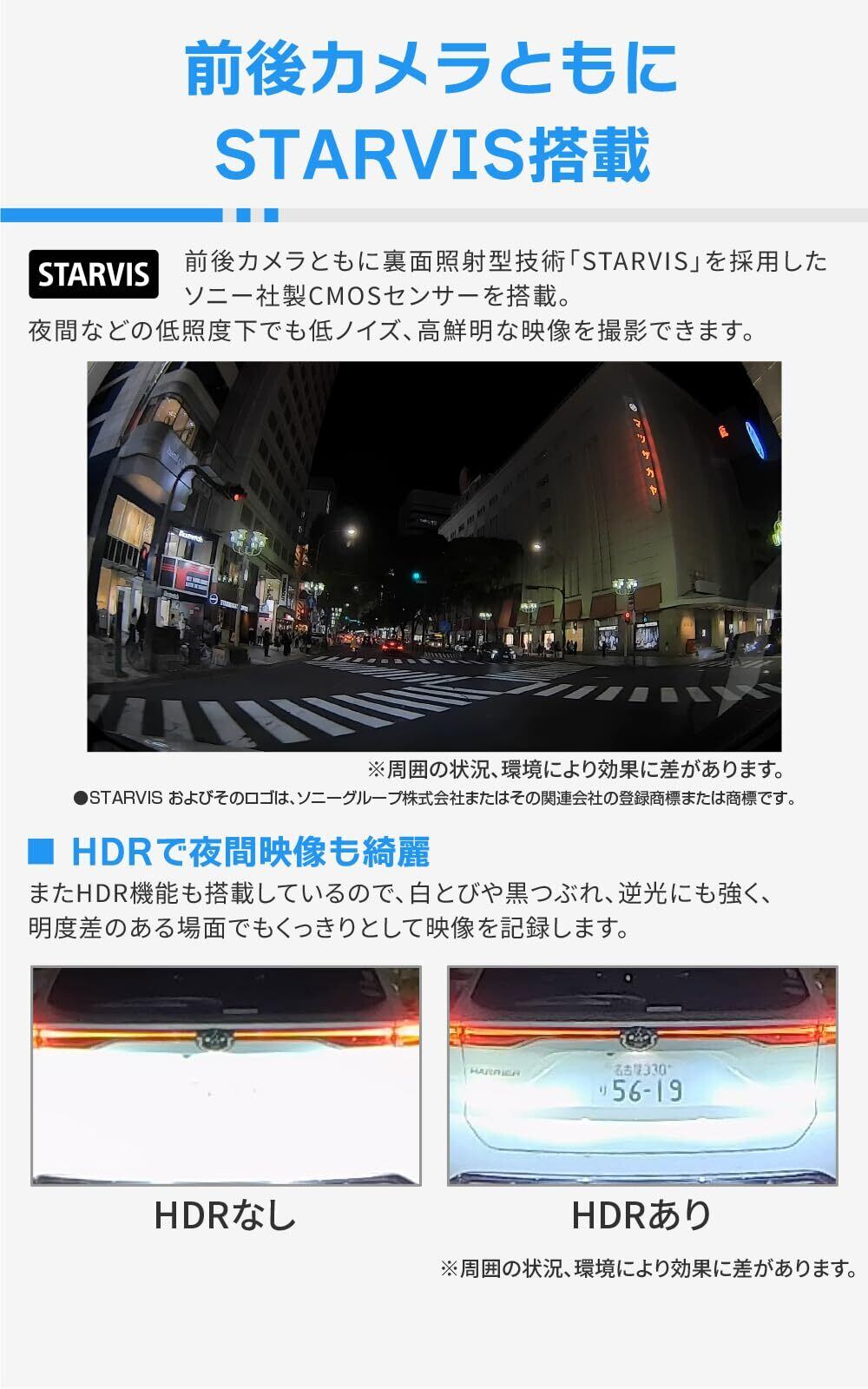 前後カメラともに裏面照射型技術「STARVIS」を採用したソニー社製CMOSセンサーを搭載。