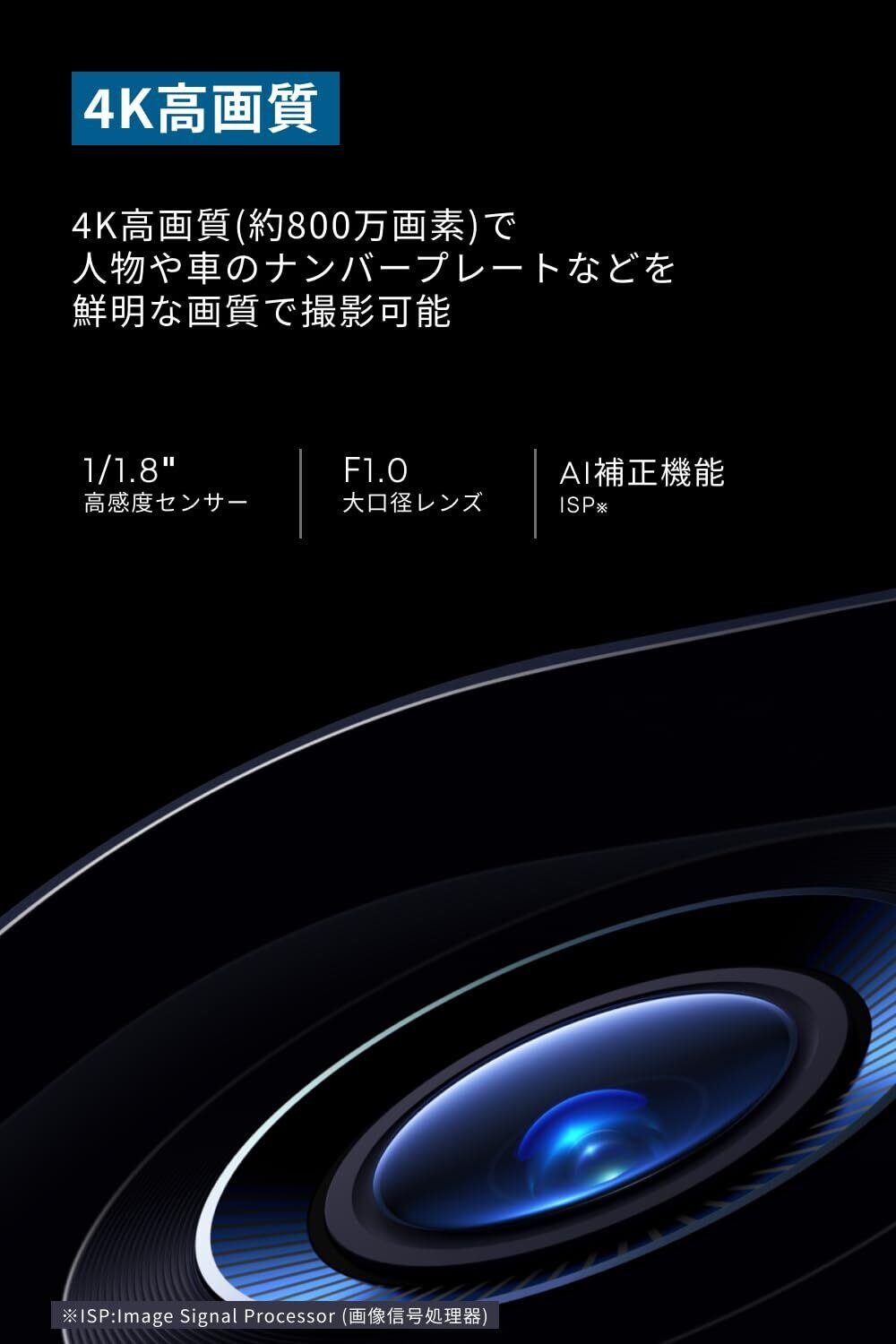 4K高画質:4K高画質(約800万画素)で、人物や車のナンバープレートなどを鮮明な画質で撮影可能。