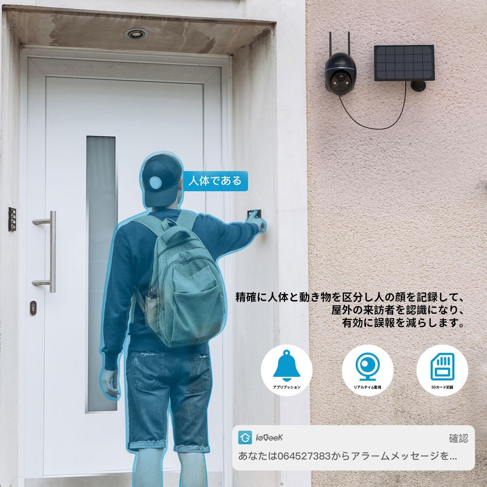 このieGeek防犯カメラは、500万画素の高解像度を備え、鮮明でクリアな映像を提供します。屋外設置も安心して行える設計で、最新のPIR人体検知機能が搭載されているため、侵入者を素早く感知し警告を発します。